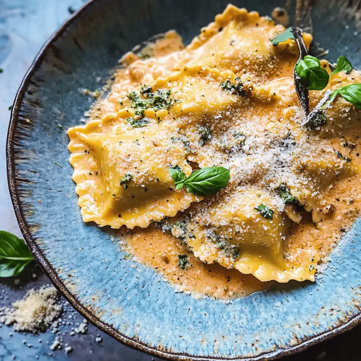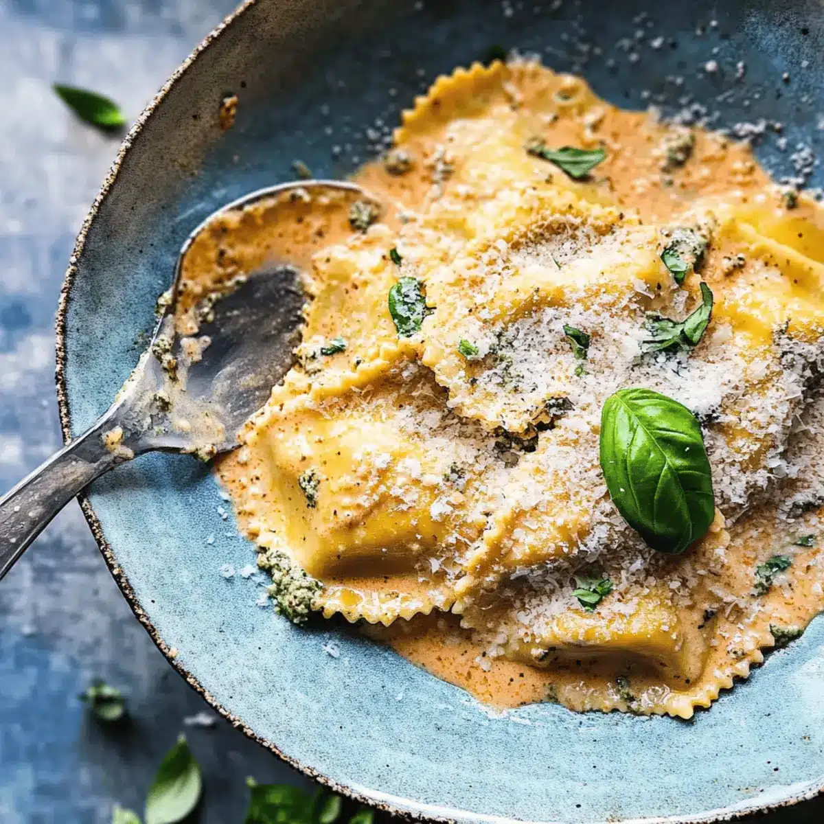 - Plate the ravioli and spoon the remaining sauce over the top. Garnish with freshly grated Parmesan cheese and extra basil leaves.