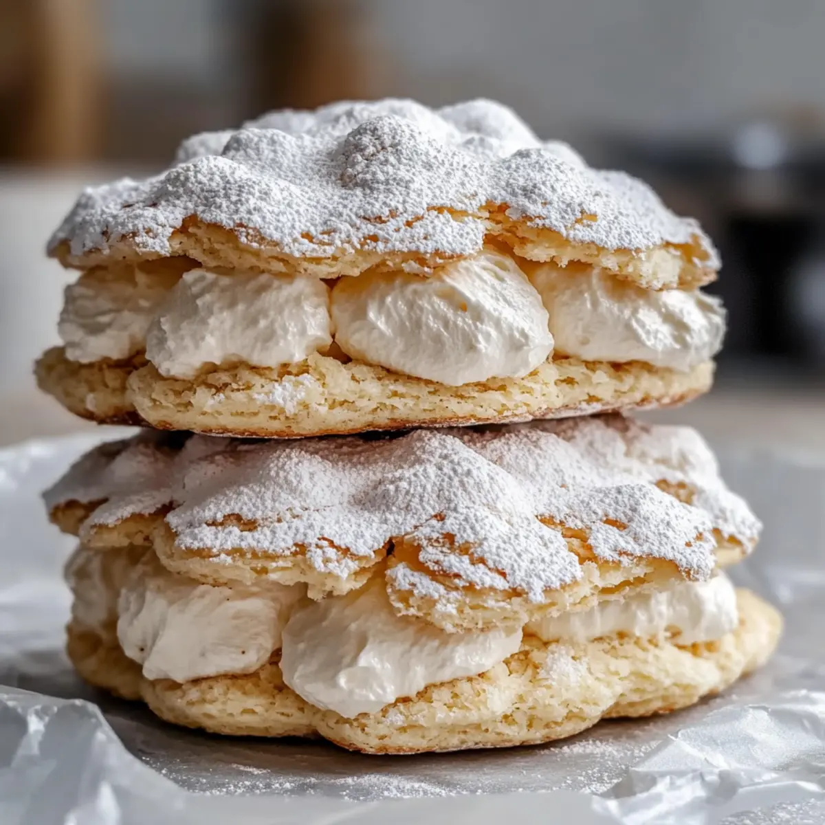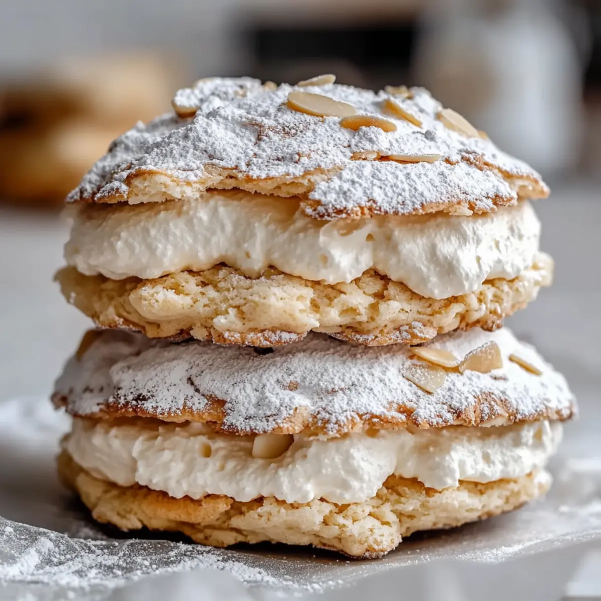To finish, dust the assembled cookies with powdered sugar and sprinkle additional toasted almonds on top for an extra flair. These elegant treats are best served fresh, so share them at your next gathering to impress friends and family with the light, airy beauty of your Almond Dacquoise Cream Clouds.