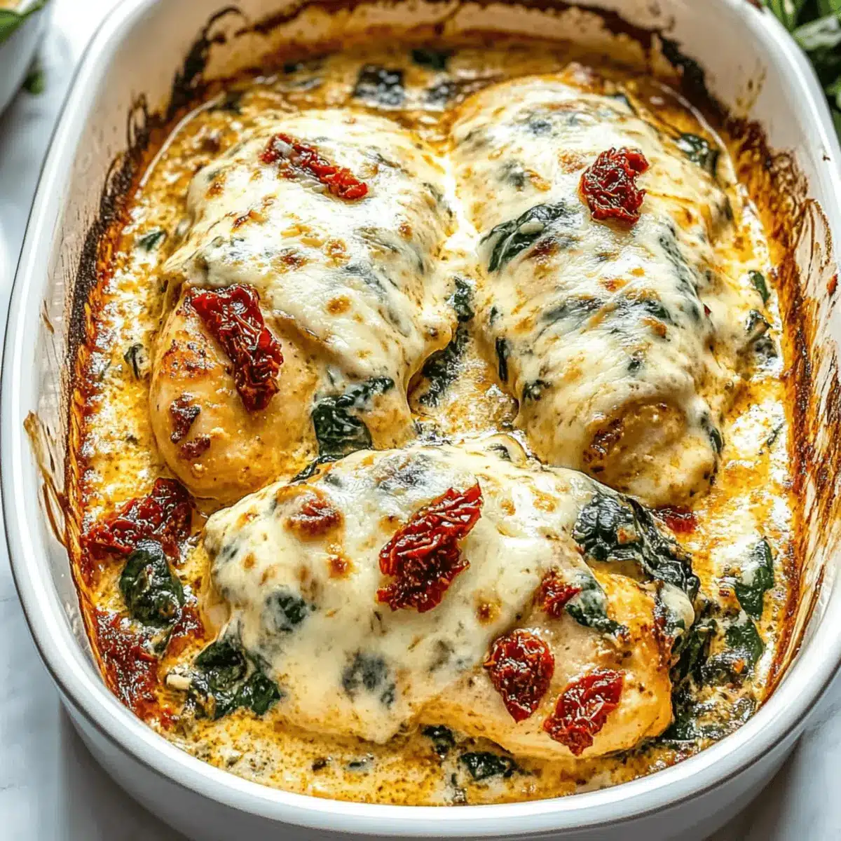 Creamy Comfort: The Baked Tuscan Chicken Casserole features a luscious blend of cream cheese and heavy cream, making each bite decadent and delightful.