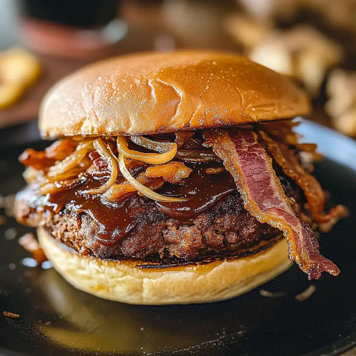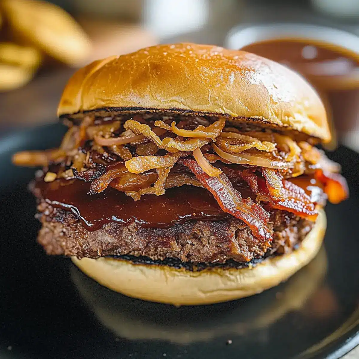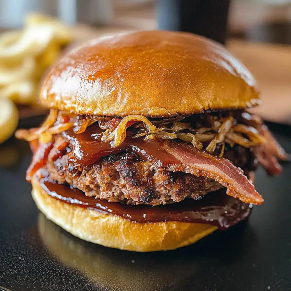 7. Assemble the burger with BBQ sauce, bacon, and fried shallots between the brioche buns.