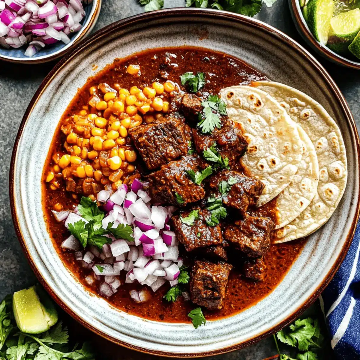 - Once the beef is tender, skim excess oil, ladle into bowls, and serve with warm tortillas and fresh toppings.