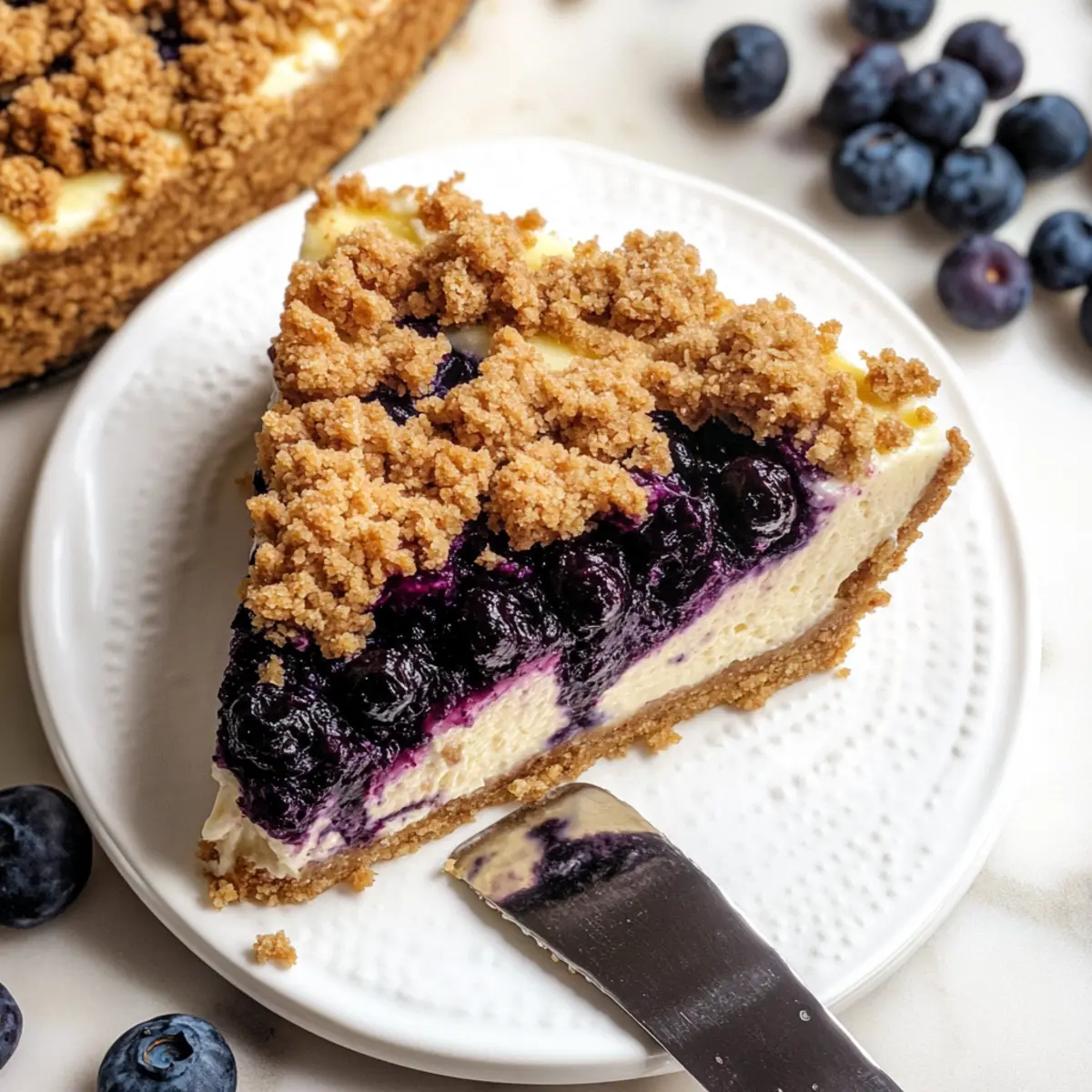 Decadent Layers: Each slice is a stunning showcase of creamy cheesecake filling, topped with an irresistible blueberry crumble, ensuring a delightful bite every time.