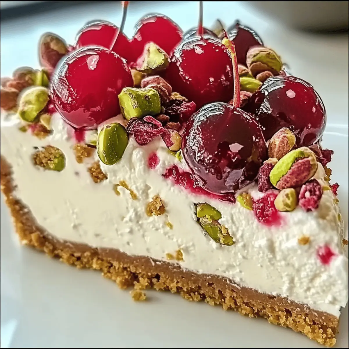 Indulge in a creamy Cherry Pistachio Cheesecake, a stunning dessert combining rich pistachio and sweet cherries.
