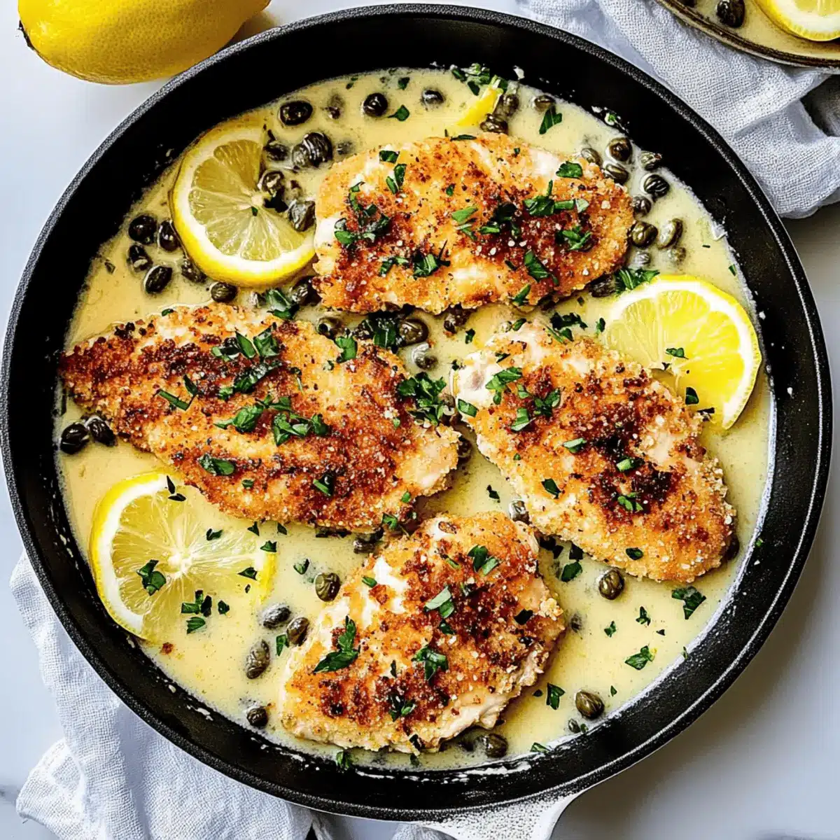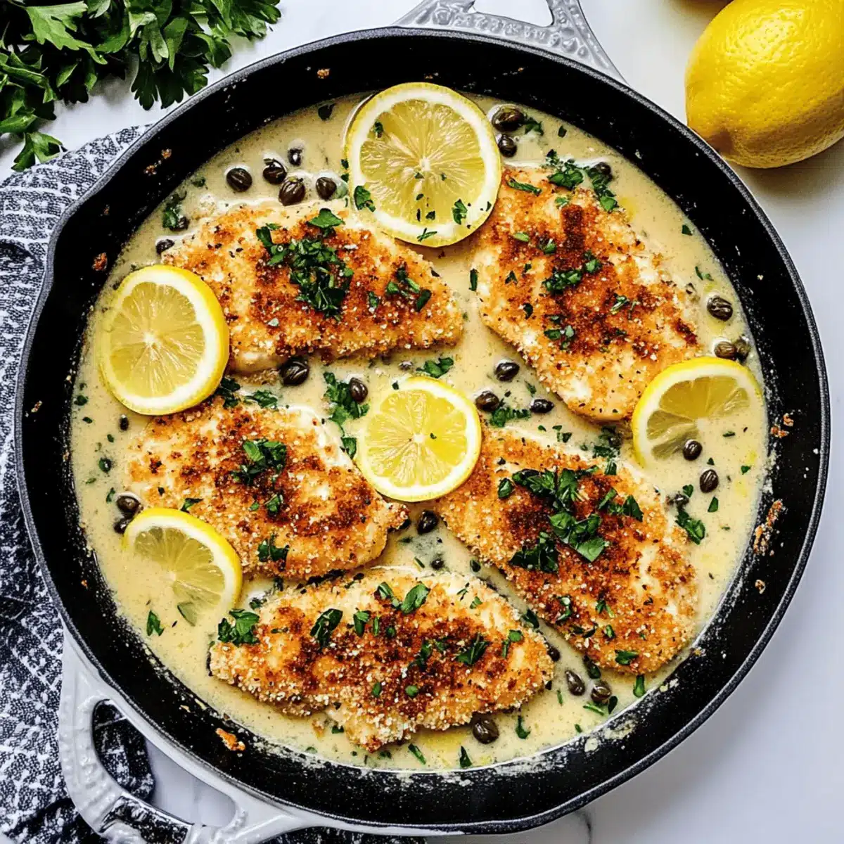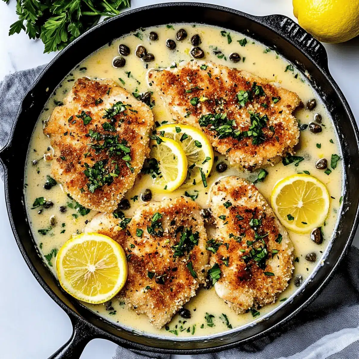 To finish, stir in the lemon juice, capers, and any remaining butter to create a glossy, bright sauce. Return the fried chicken cutlets to the skillet, allowing them to simmer briefly in the sauce to absorb its wonderful flavors for about 2 minutes. Finally, garnish with slices of fresh lemon and a sprinkle of chopped parsley for a burst of color before serving your delicious Chicken Piccata.