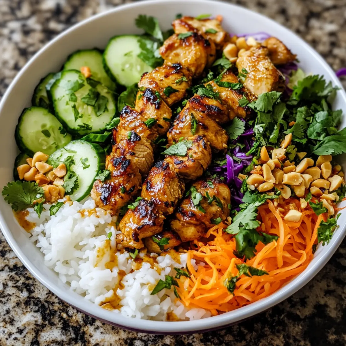 - In a large bowl, layer your choice of base—either rice or noodles. Add chopped fresh vegetables like cabbage, cucumber, and carrots over the base, followed by the grilled chicken skewers.