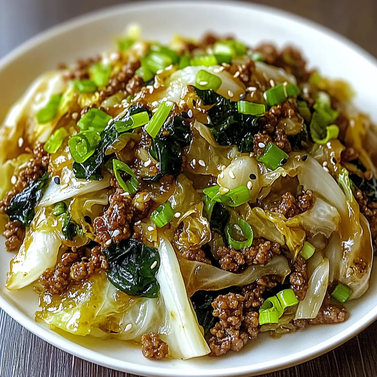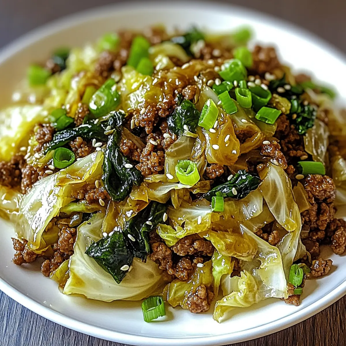 Remove the skillet from heat and serve your mouthwatering Chinese Ground Beef and Cabbage Stir-Fry over cooked rice or noodles. Garnish generously with sliced green onions and sprinkle sesame seeds on top if desired. This finishing touch not only adds visual appeal but also enhances the dish’s crunch and flavor.