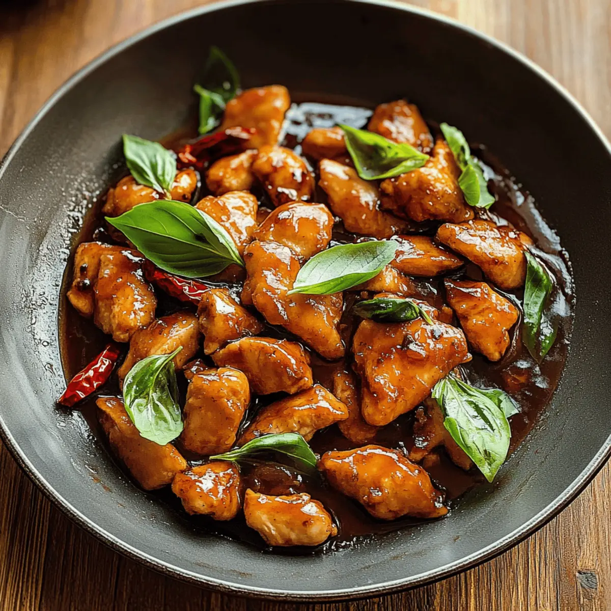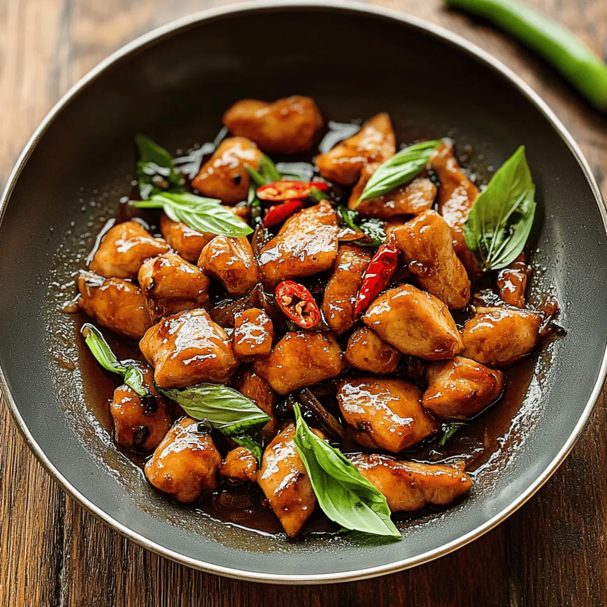 Once cooked, toss in the fresh Thai basil leaves, allowing them to wilt in the heat for a minute. Remove the wok from heat and serve your vibrant Chinese Three Cup Chicken over a bed of steamed rice. Drizzle with chili oil for an added kick if desired, and enjoy this comforting meal with family and friends.