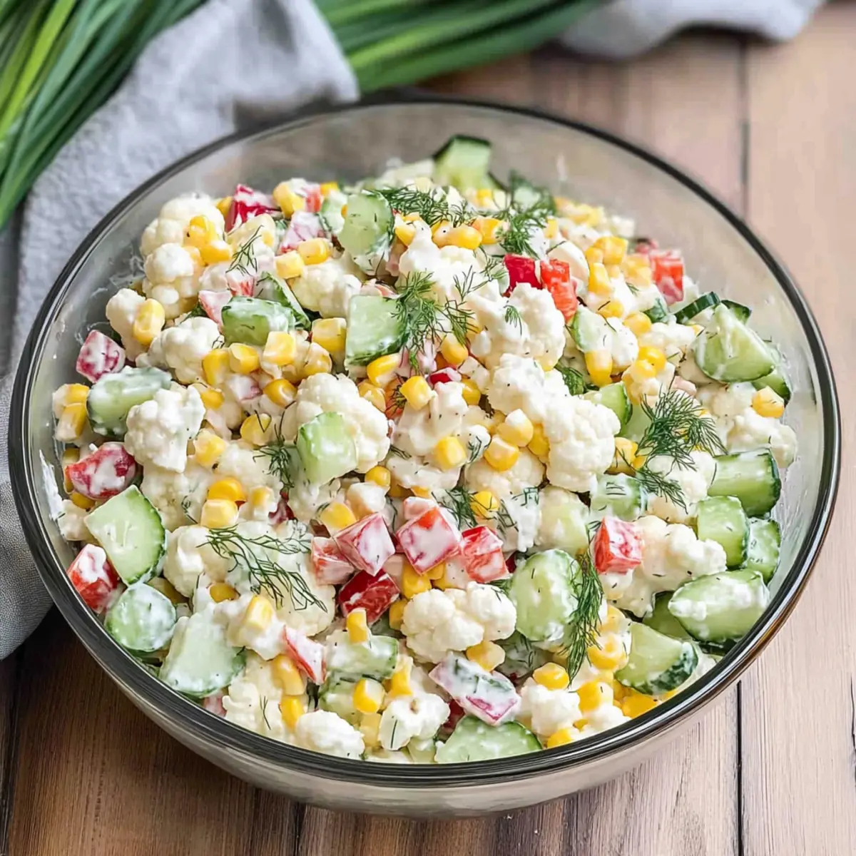 4. In a large bowl, fold in the drained corn with the chopped cauliflower, cucumbers, red pepper, and green onions.