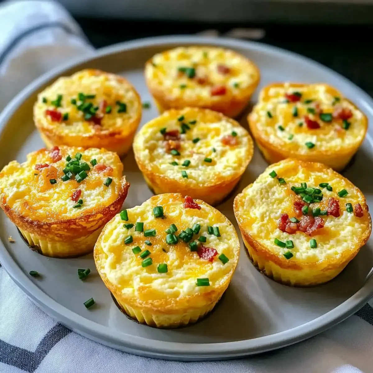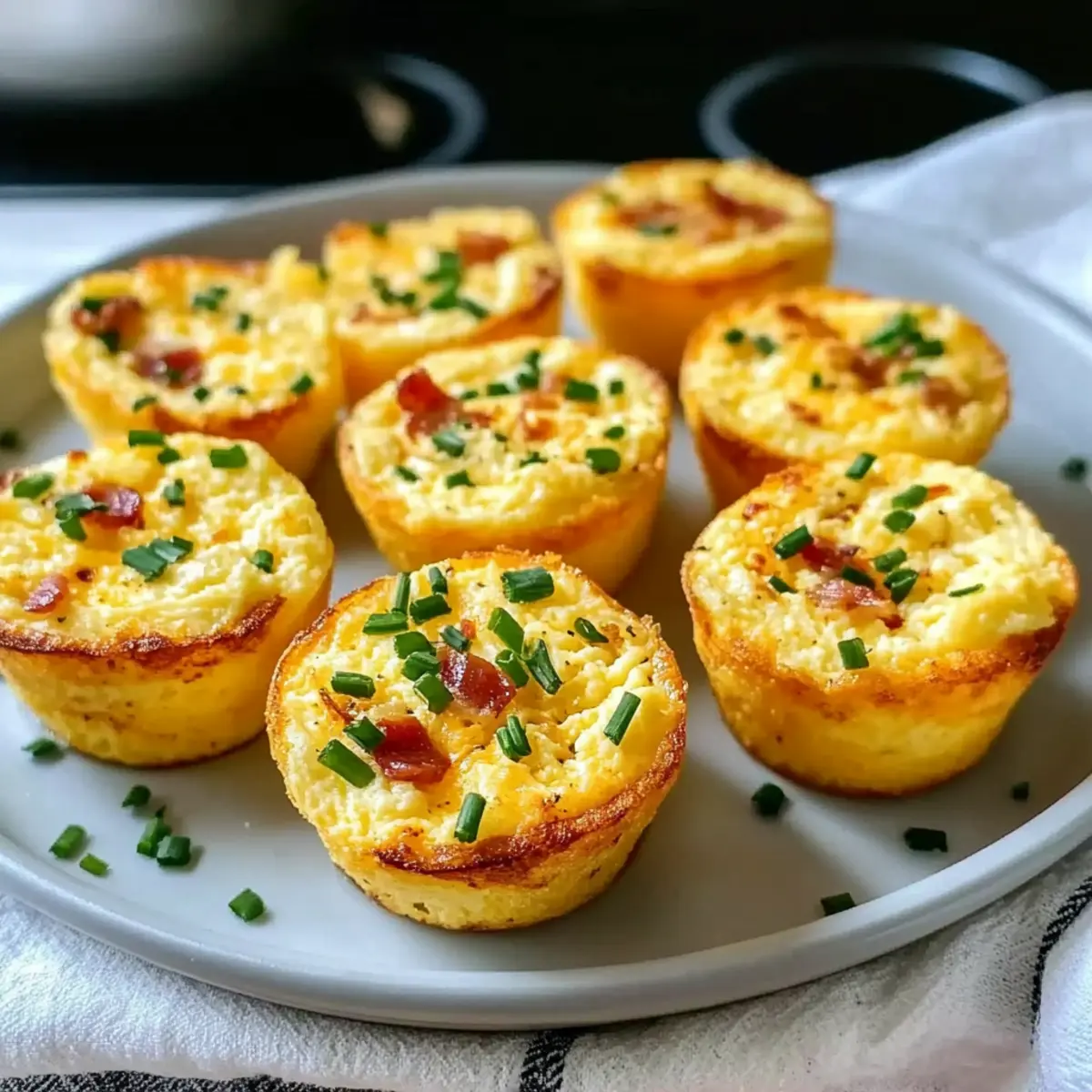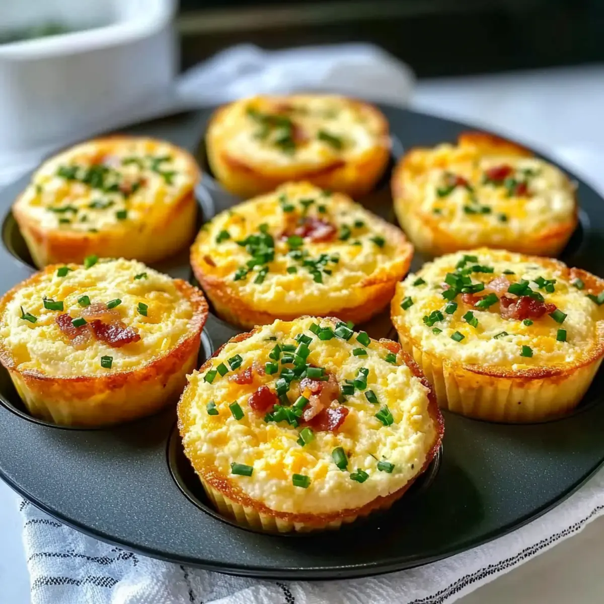 - Sprinkle cooked bacon, shredded cheddar, and chives on top of each muffin cup.