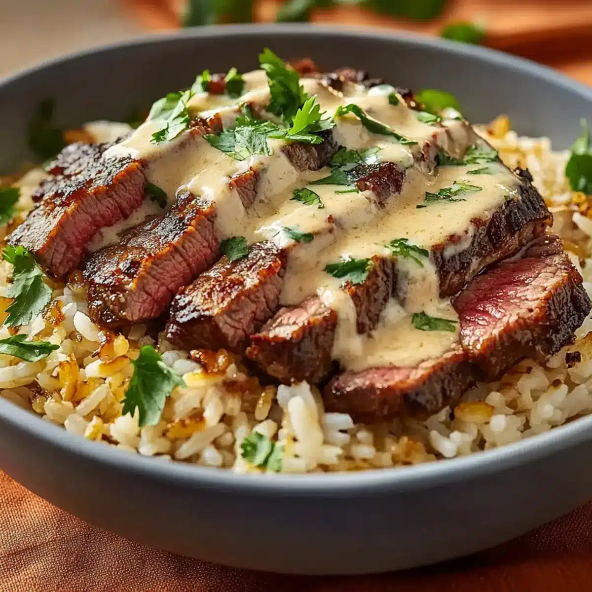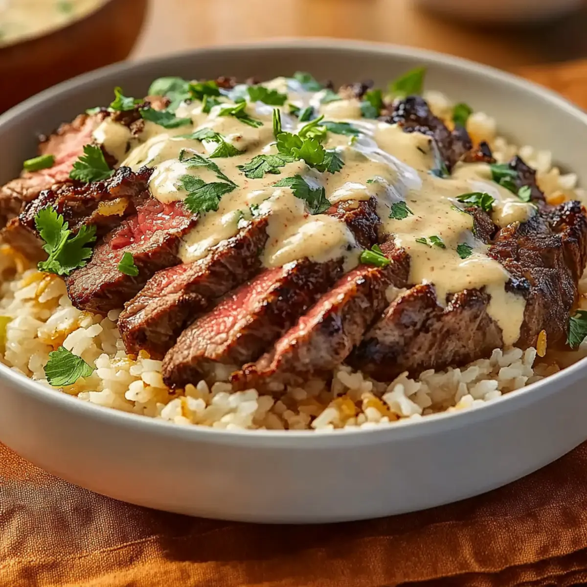 After the steak has rested, slice it against the grain into thin strips. Fluff the cooked rice with a fork and divide it among serving bowls. Arrange the steak strips on top and generously drizzle with the creamy garlic sauce. Finish by garnishing with fresh cilantro for added flavor, and your Creamy Garlic Steak & Rice Bowls are ready to impress!