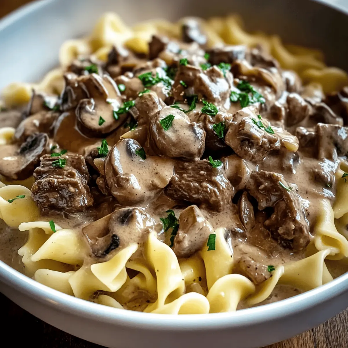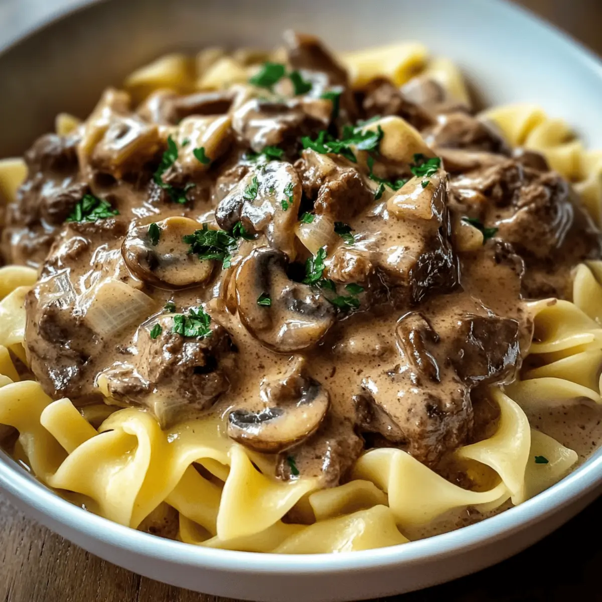 Ladle generous portions of the beef stroganoff over the hot noodles or rice. If desired, sprinkle with freshly chopped parsley for a vibrant touch. The creamy sauce will cling to the beef and noodles, creating a heartwarming dish that’s sure to satisfy.