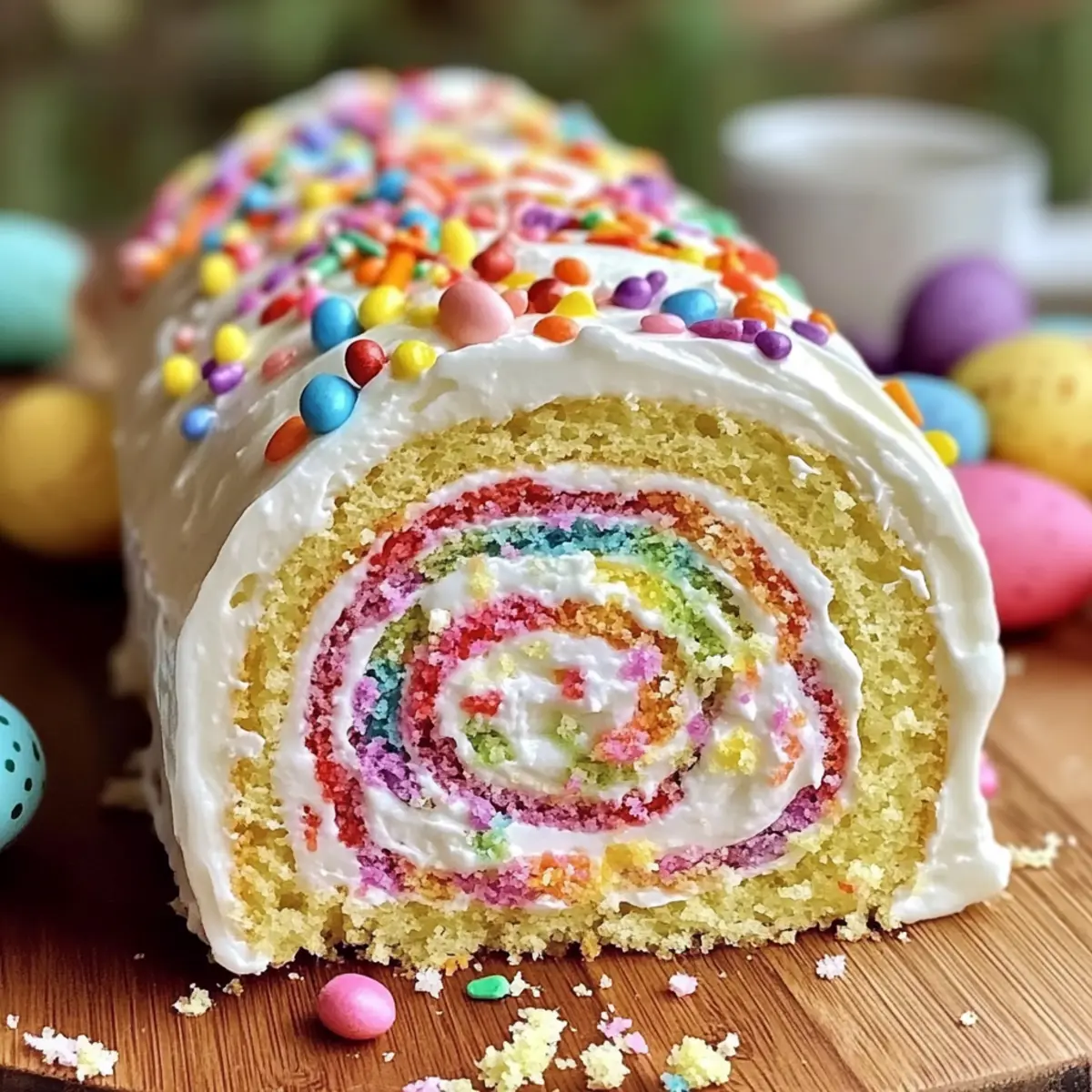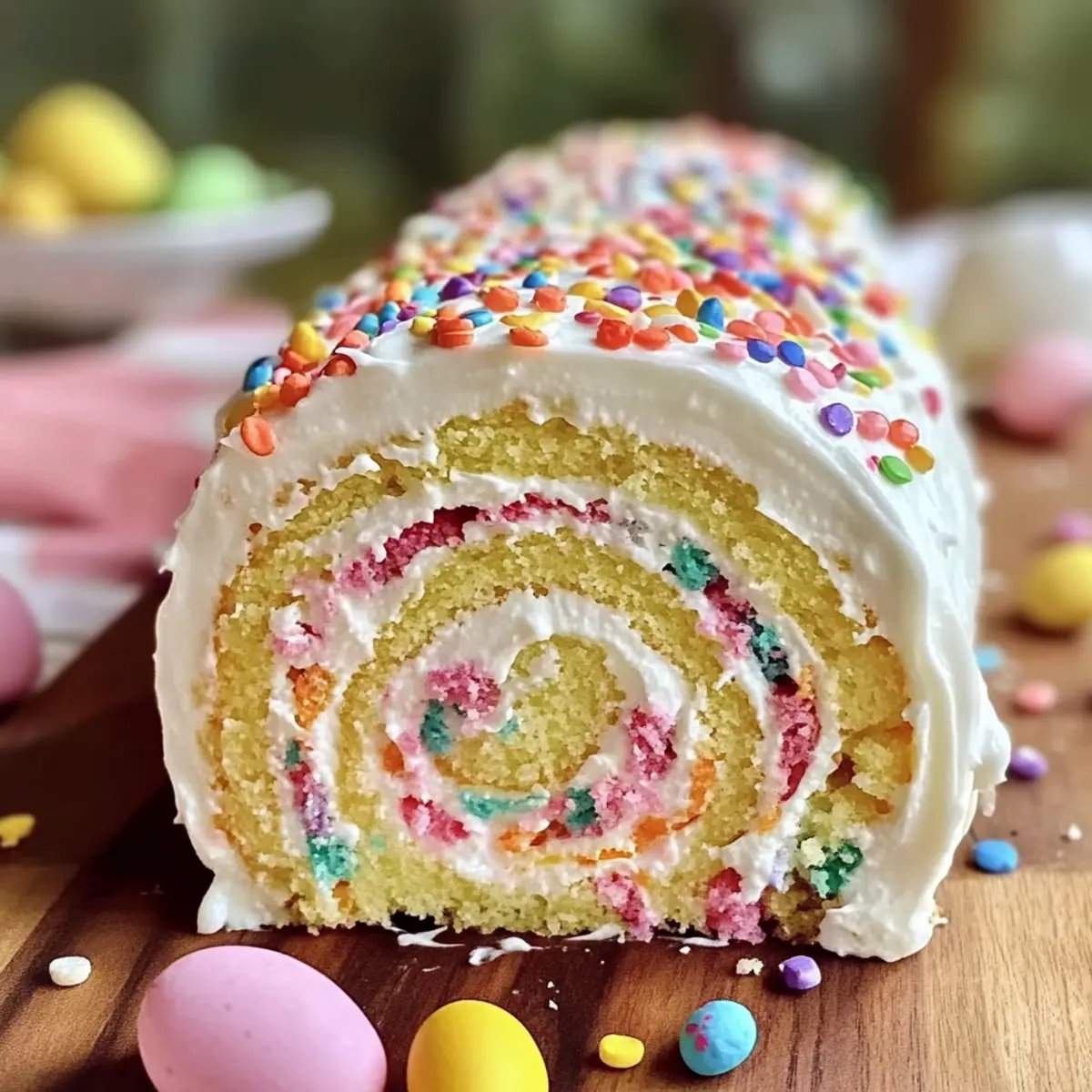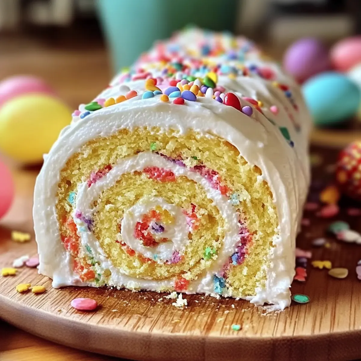 Perfect for Spring: Bursting with vibrant colors and festive sprinkles, this cake roll adds a cheerful touch that’s perfect for Easter brunch or any spring celebration.