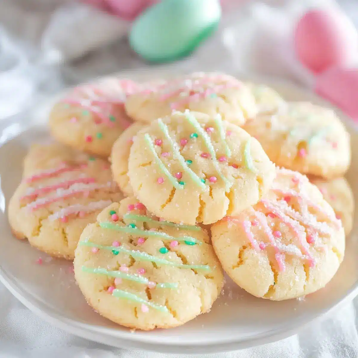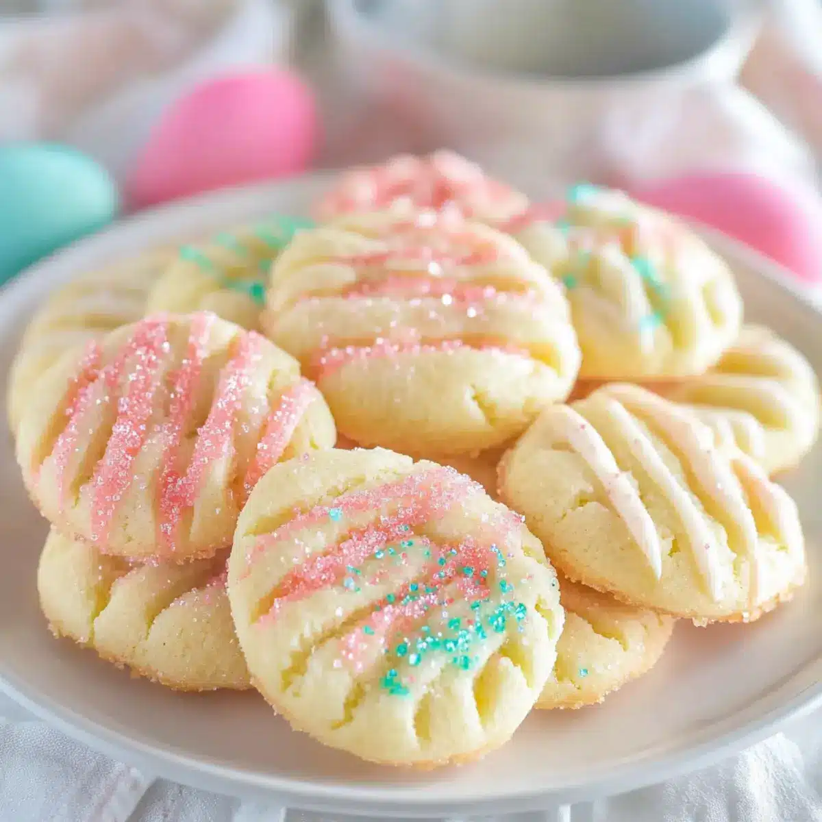 • Sanding Sugar in Pastel Colors – Enhances visual appeal and festive charm; can be replaced with regular granulated sugar or omitted for simpler cookies.