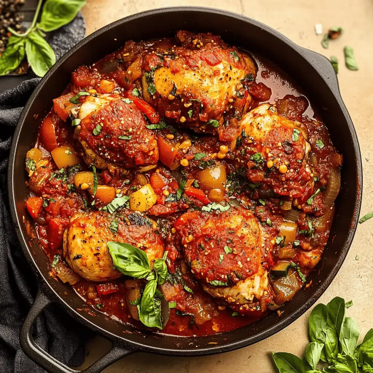 Once baked, the Easy Chicken Cacciatore will be bubbling and fragrant! Remove it from the oven, and garnish generously with fresh basil. Serve hot in bowls alongside a side of crusty bread or a fresh salad, ensuring everyone can enjoy every last drop of the delicious, hearty tomato sauce.