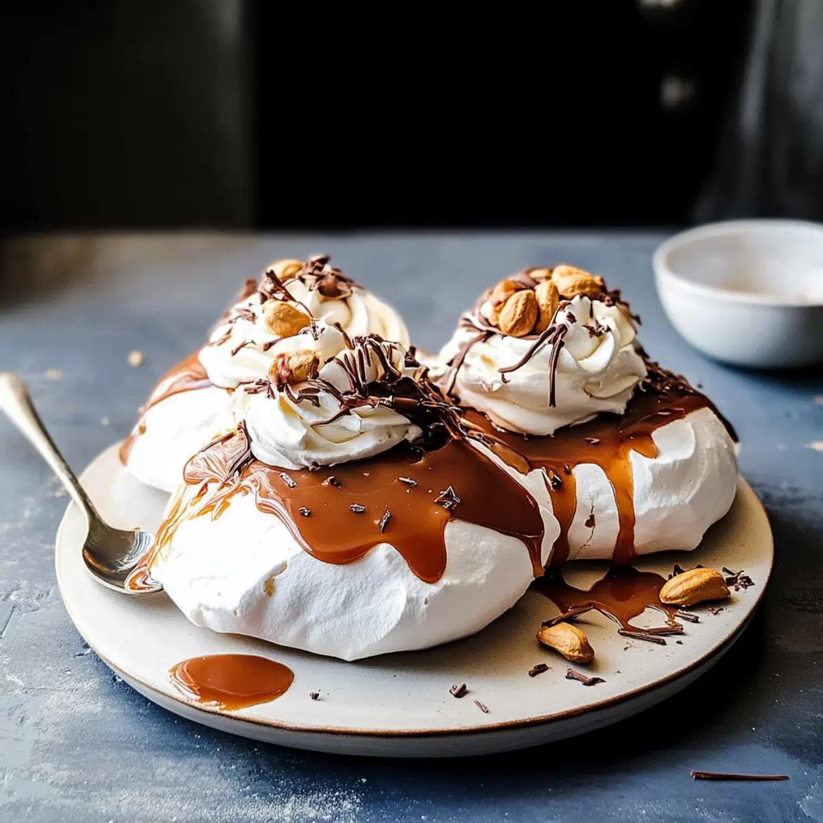 After the meringues have cooled completely, whip the cream in a clean bowl until stiff peaks form. Spoon generous dollops of whipped cream atop each pavlova, allowing it to cascade slightly over the edges. Drizzle the prepared salted caramel sauce generously over the cream and top with honey-roasted peanuts for added texture and flavor, creating an irresistible Easy Chocolate Pavlova.