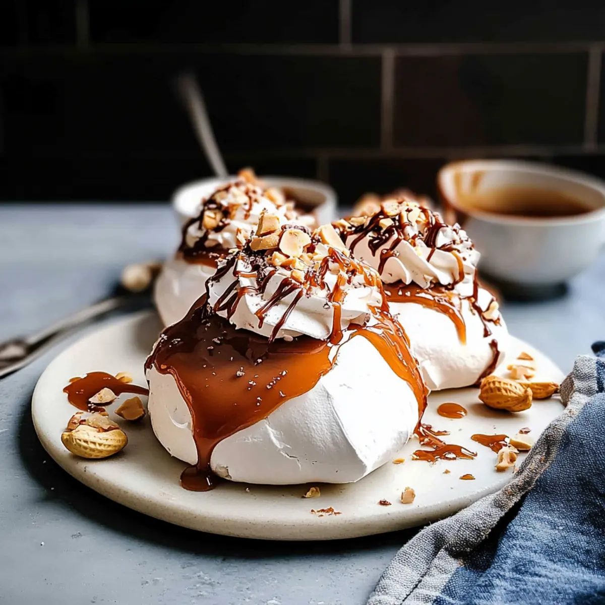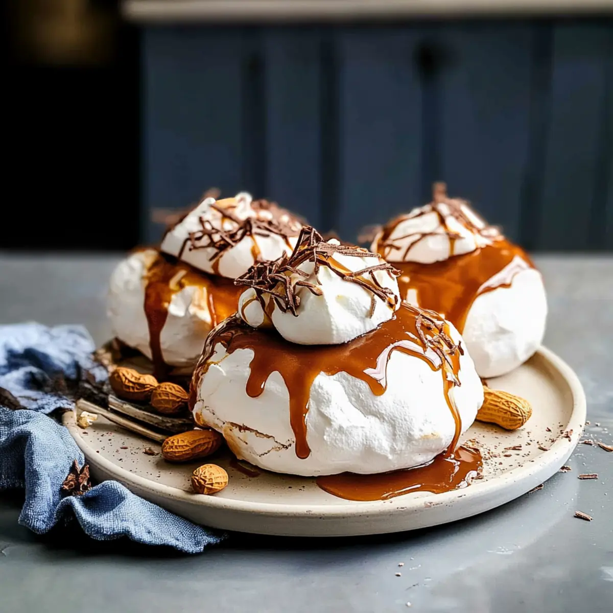 - After cooling, whip the cream, dollop on each pavlova, drizzle with caramel, and top with honey-roasted peanuts.