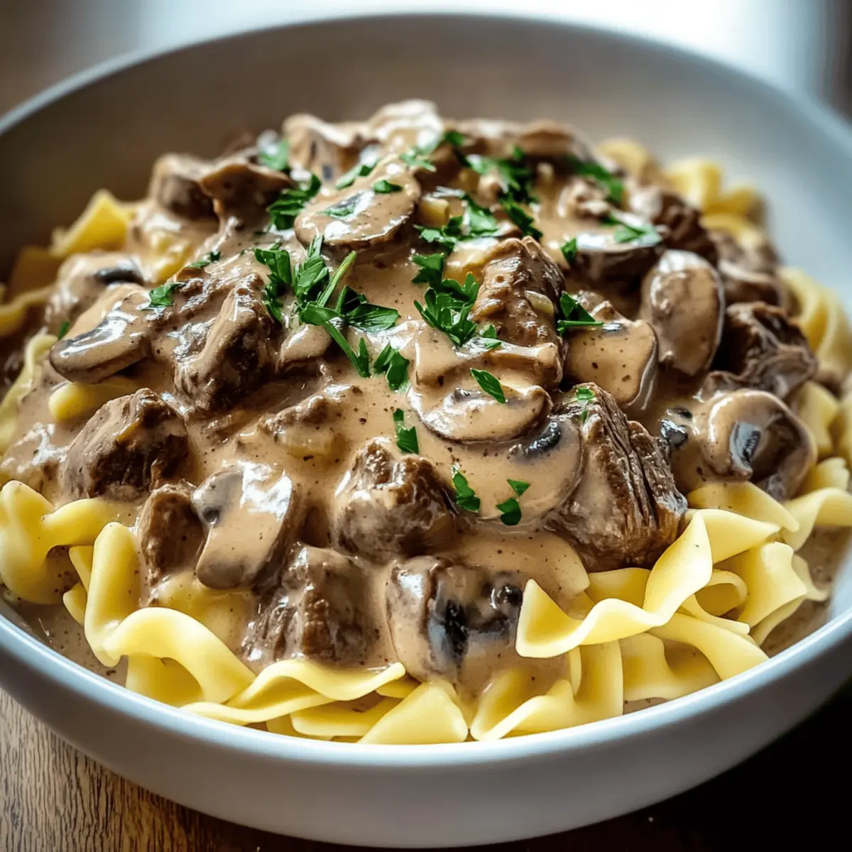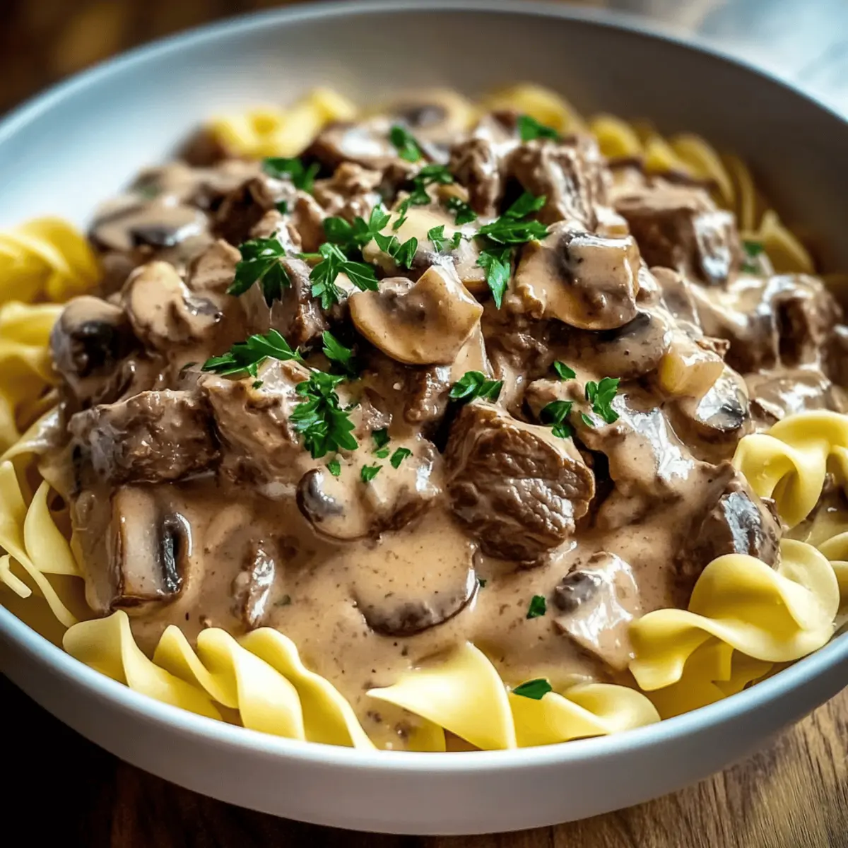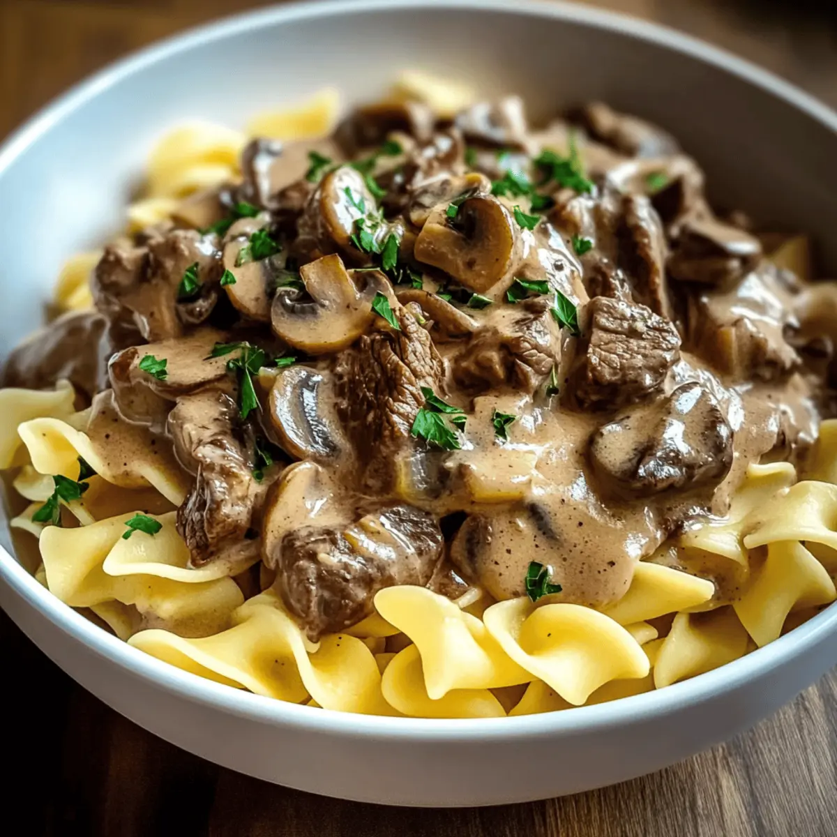 7. Serve beef stroganoff over noodles or rice, garnished with fresh parsley.