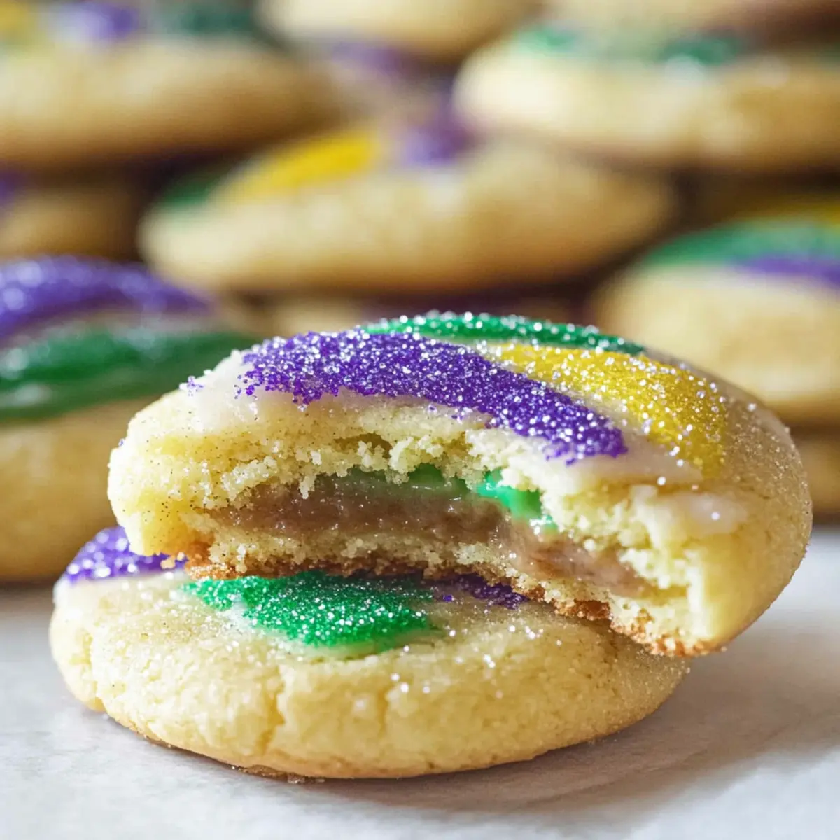 These Easy Mardi Gras Cookies are perfect for meal prep enthusiasts looking to save time for their busy celebrations! You can prepare the cinnamon filling up to 24 hours in advance; simply mix the melted butter, brown sugar, and cinnamon, form it into mounds, and freeze them. The cookie dough itself can also be made up to 3 days before baking. Just keep it covered in the refrigerator to maintain its freshness. When you’re ready to bake, let the dough sit at room temperature for about 10 minutes, then scoop, stuff with the frozen filling, and bake according to the recipe. This allows you to enjoy delicious, homemade cookies with minimal last-minute effort!