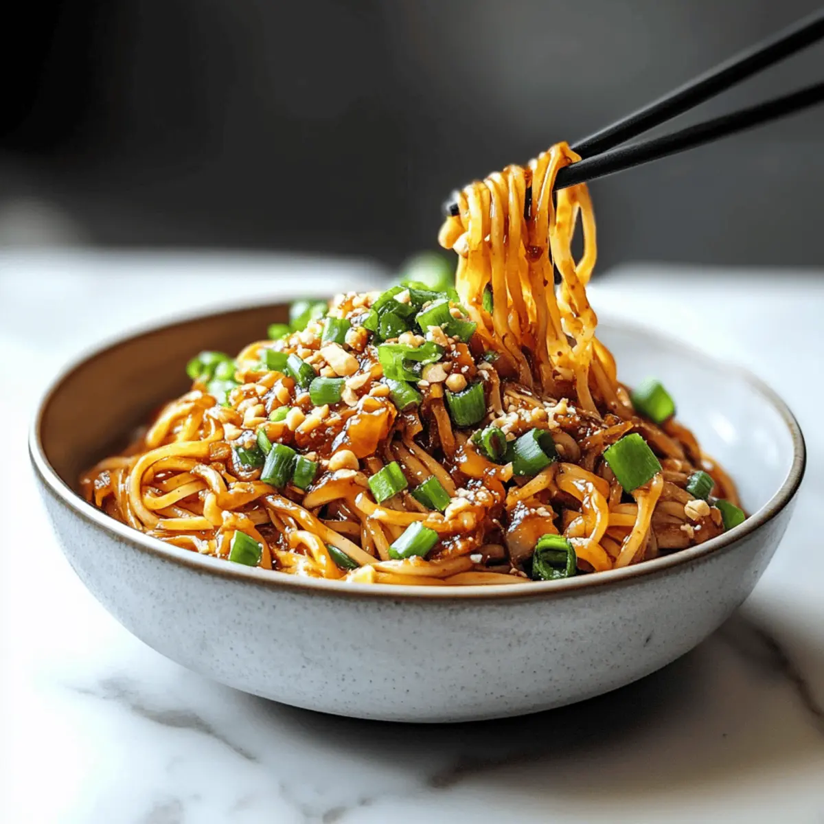 Remove the pan from heat and sprinkle the chopped green onions on top for added freshness. For an optional finishing touch, garnish your Easy Szechuan Noodles with a sprinkle of crushed peanuts or sesame seeds. Serve immediately, allowing everyone to enjoy the warmth and spice of this delightful dish!