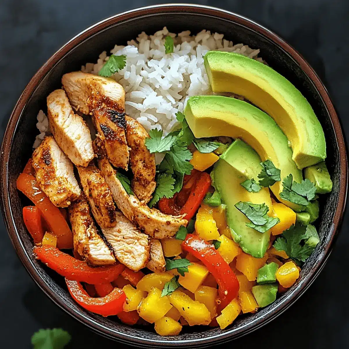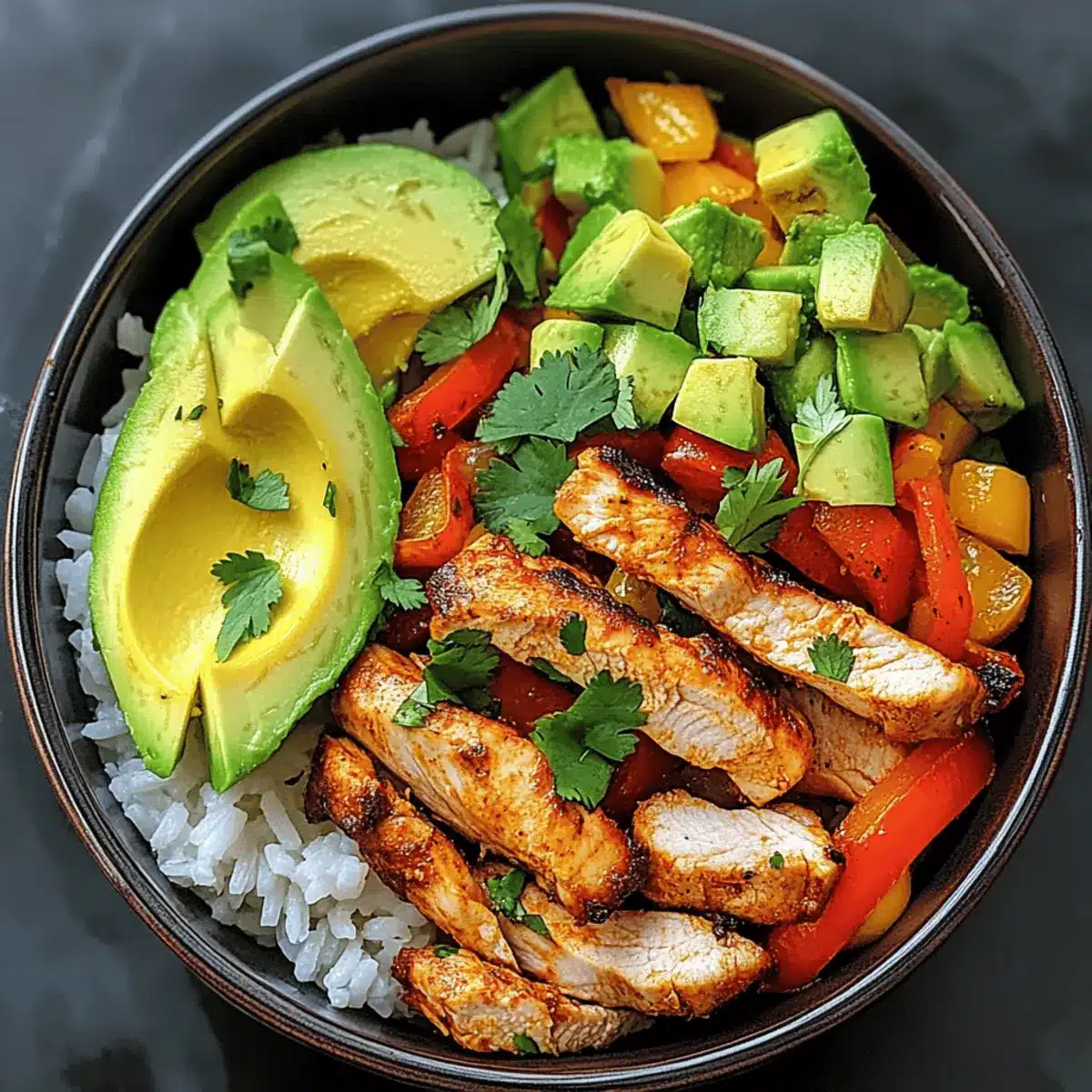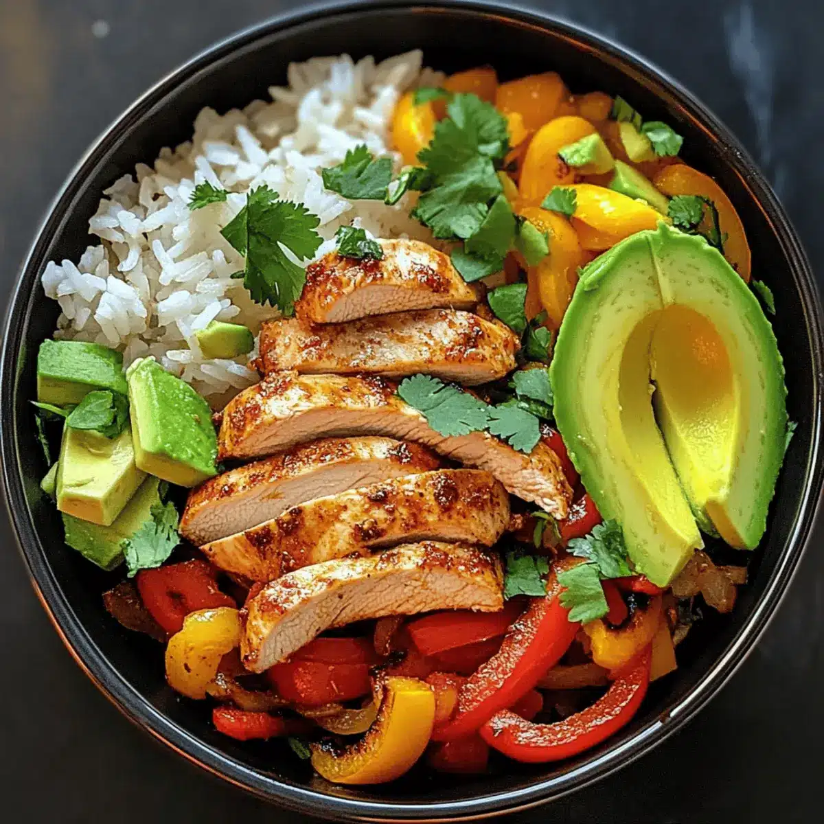 5. Assemble your Fajitas Chicken Bowl with a base of rice, topped with chicken, sautéed veggies, avocado slices, and cilantro.