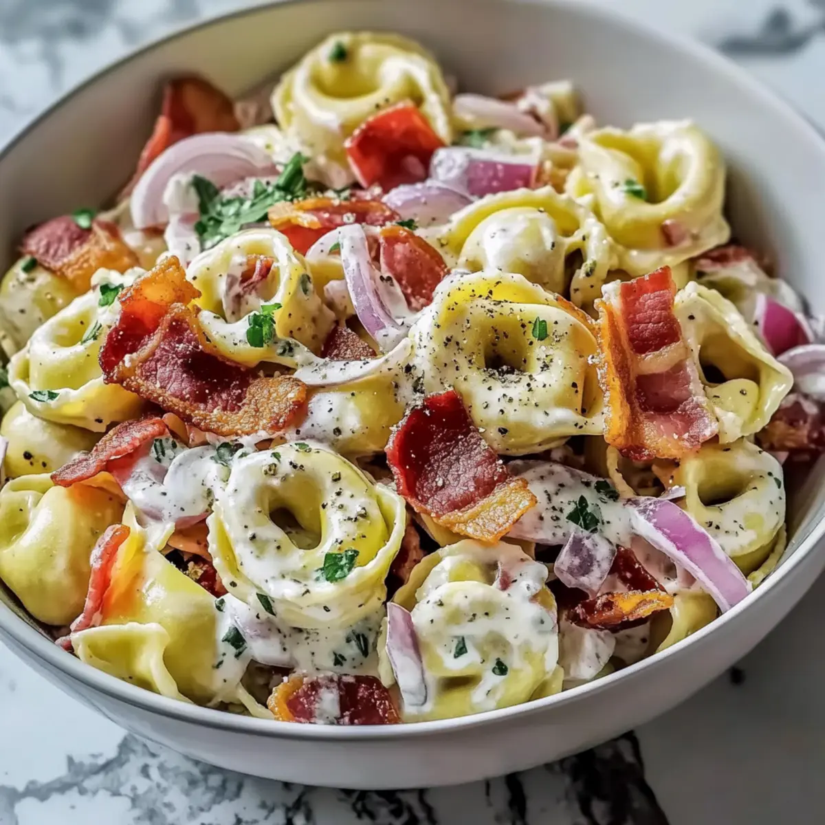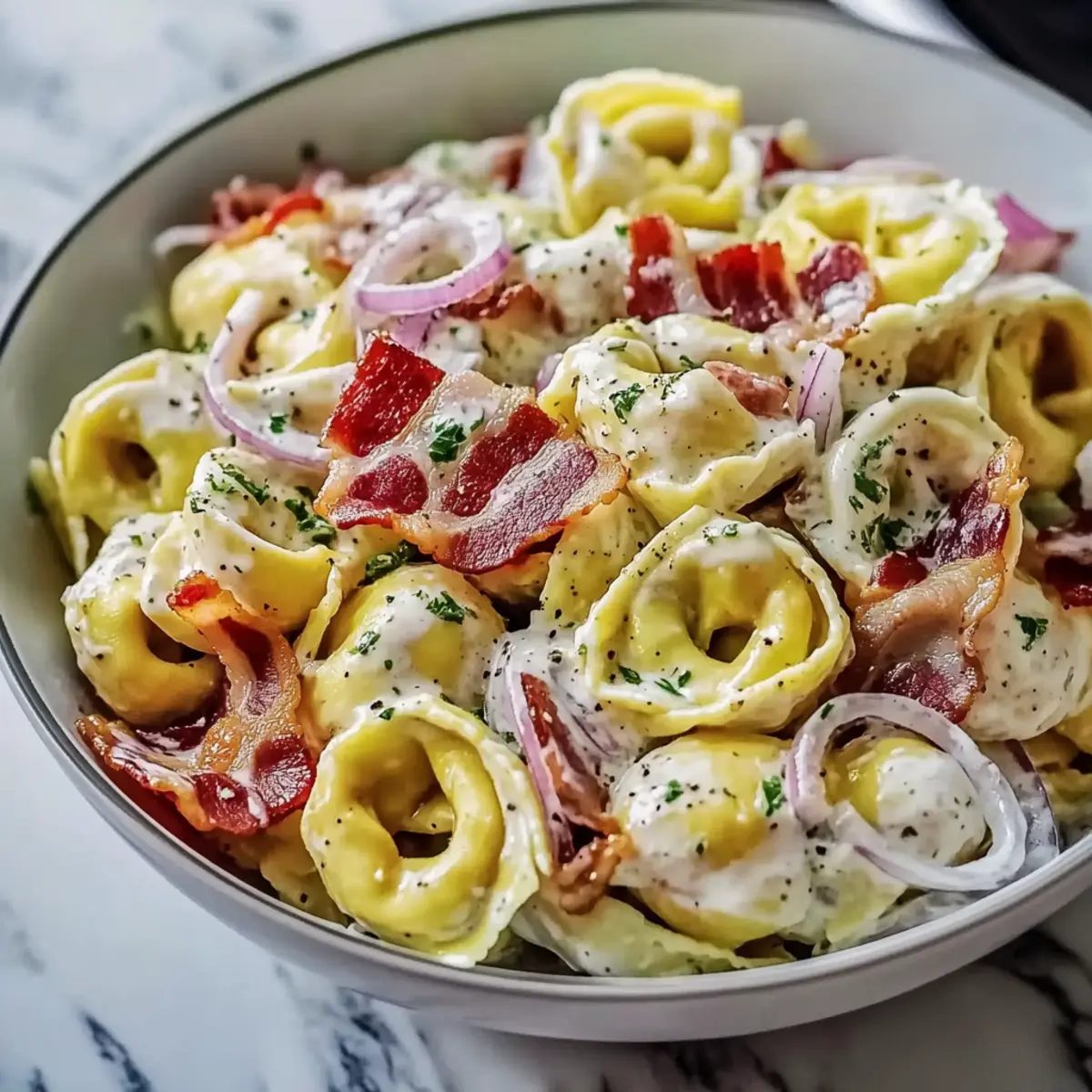 - Combine cooled tortellini, sliced pepperoncini, chopped red onion, grated Parmesan, and reserved bacon in the bowl, tossing to coat in the dressing.