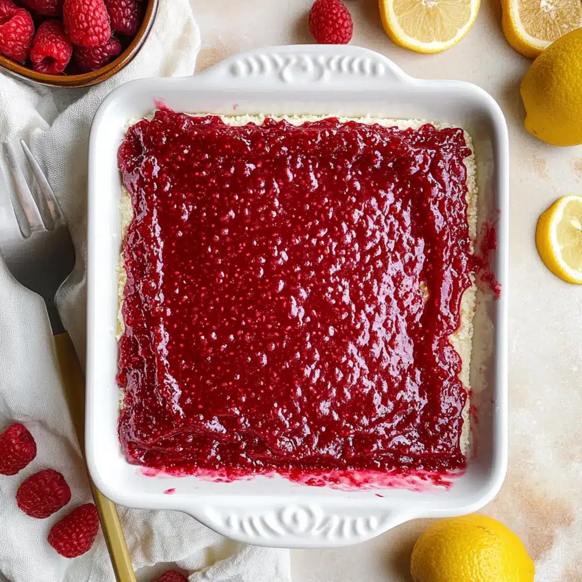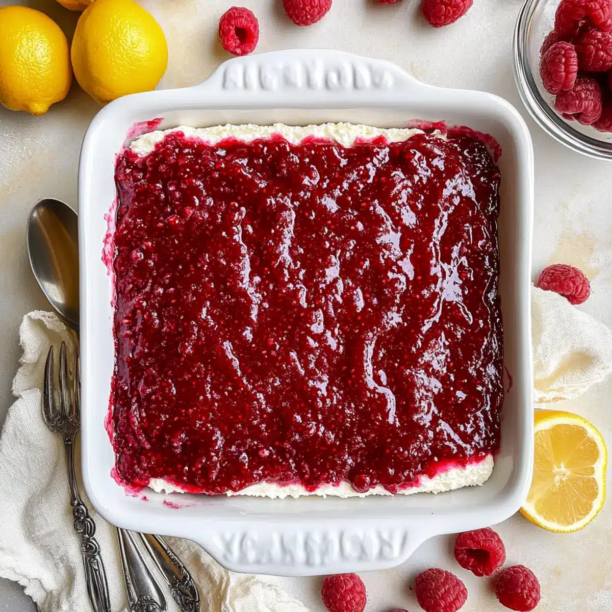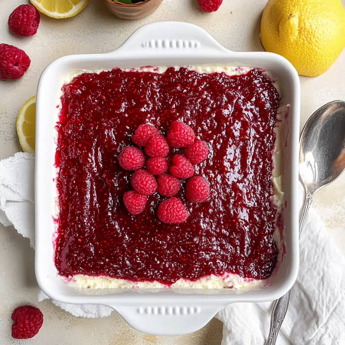 - After chilling, remove plastic wrap, top with remaining raspberry jam, and garnish with fresh raspberries and lemon slices. Serve chilled.