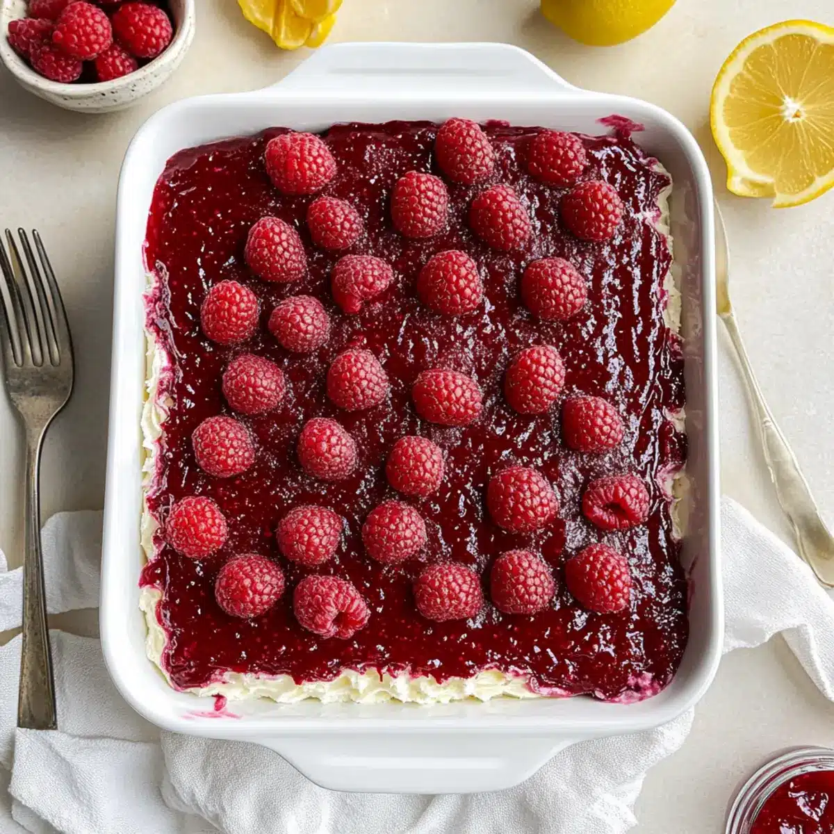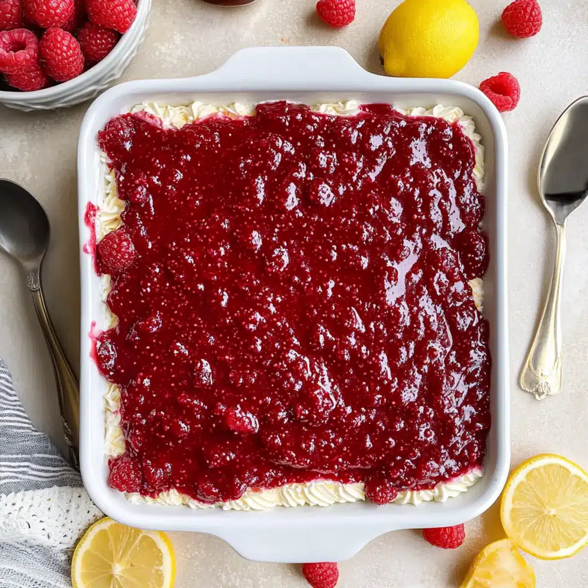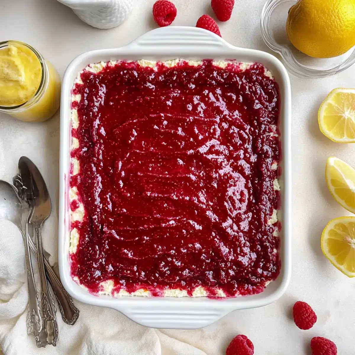 Before serving your Fresh Raspberry Tiramisu, spread the remaining raspberry jam evenly on top for a refreshing finish. For an extra touch of flair, garnish with fresh raspberries and slices of lemon. Cut into squares and serve chilled, allowing your guests to enjoy this delightful twist on the classic dessert!