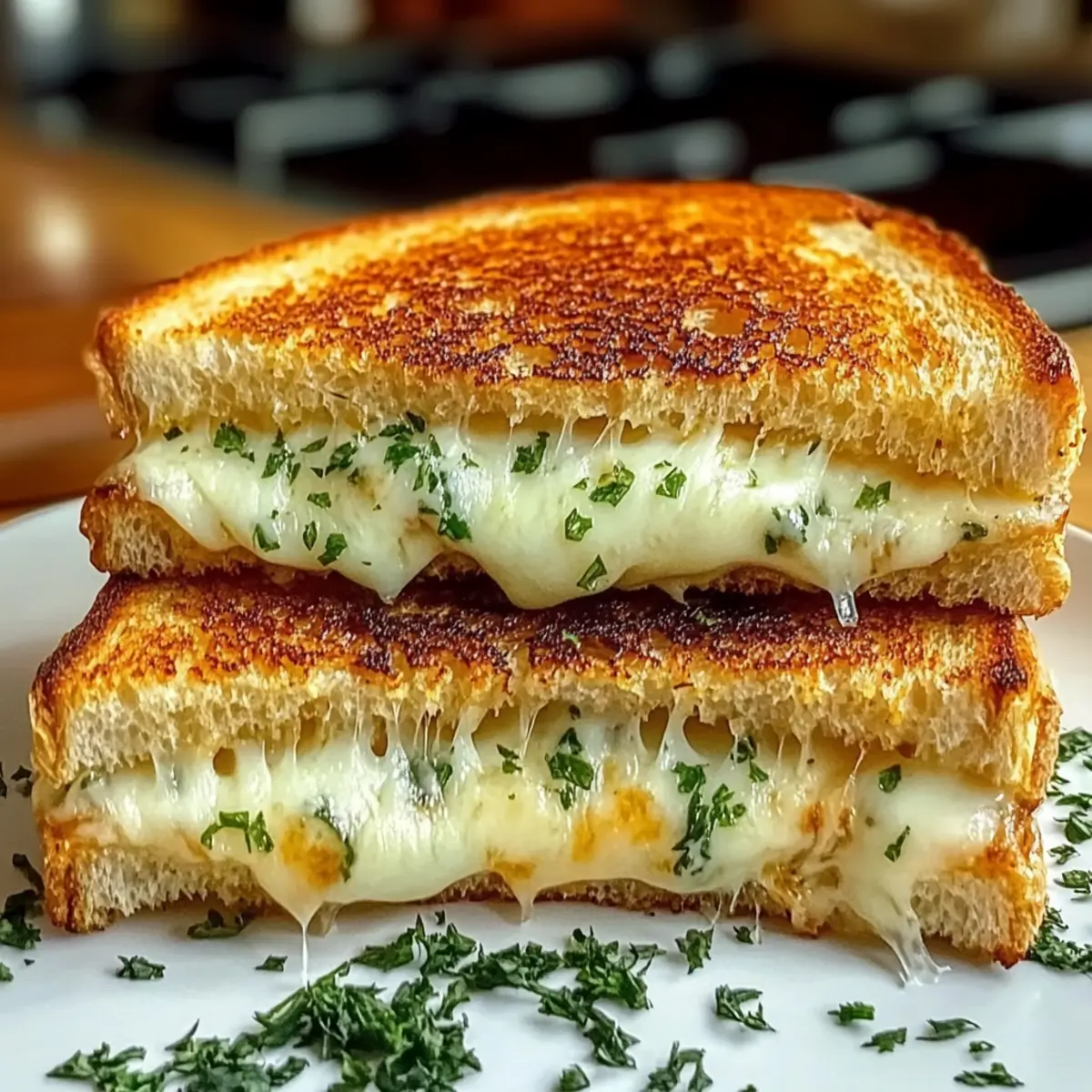 These Garlic Bread Grilled Cheese sandwiches are a dream for meal prep enthusiasts! You can prepare the garlic butter and layer the cheeses between the bread up to 24 hours in advance. Simply spread the garlic butter on each slice and assemble the sandwich, but avoid grilling until you’re ready to enjoy. Store the prepped sandwiches in an airtight container in the refrigerator to maintain freshness. When it’s time to serve, just heat a skillet over medium-low heat and grill the sandwiches for about 3-4 minutes on each side until golden and crispy. This way, you’ll still achieve that delightful cheese pull without spending precious time in the kitchen!