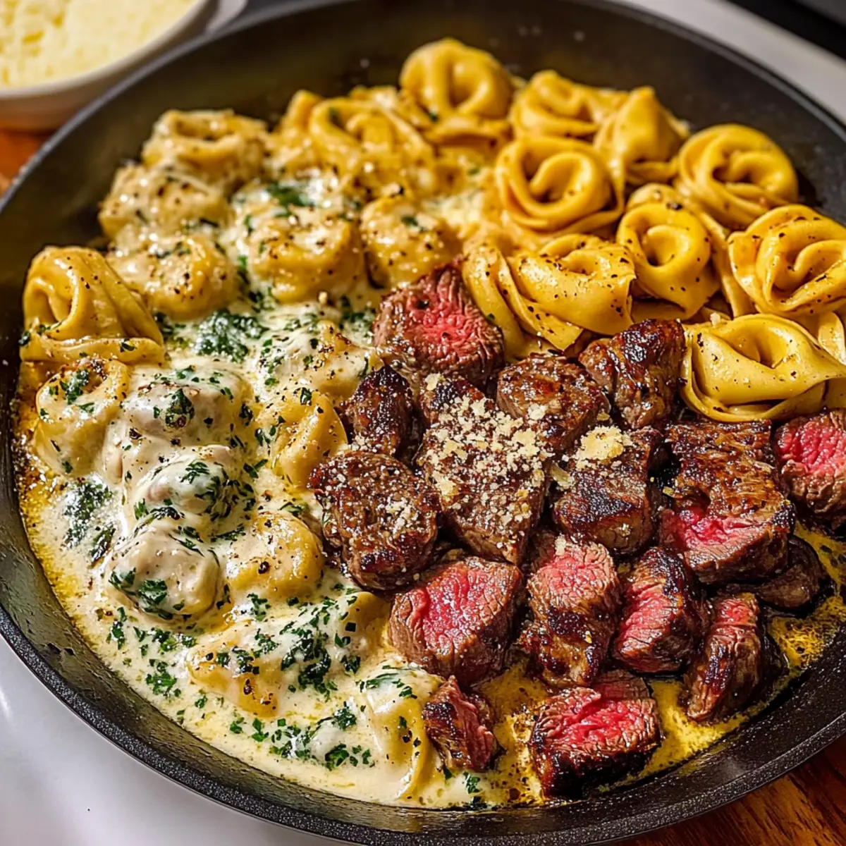 Indulgent Flavors: With a rich garlic parmesan cream sauce coating juicy steak and tender tortellini, every bite bursts with decadent taste that’s bound to impress.