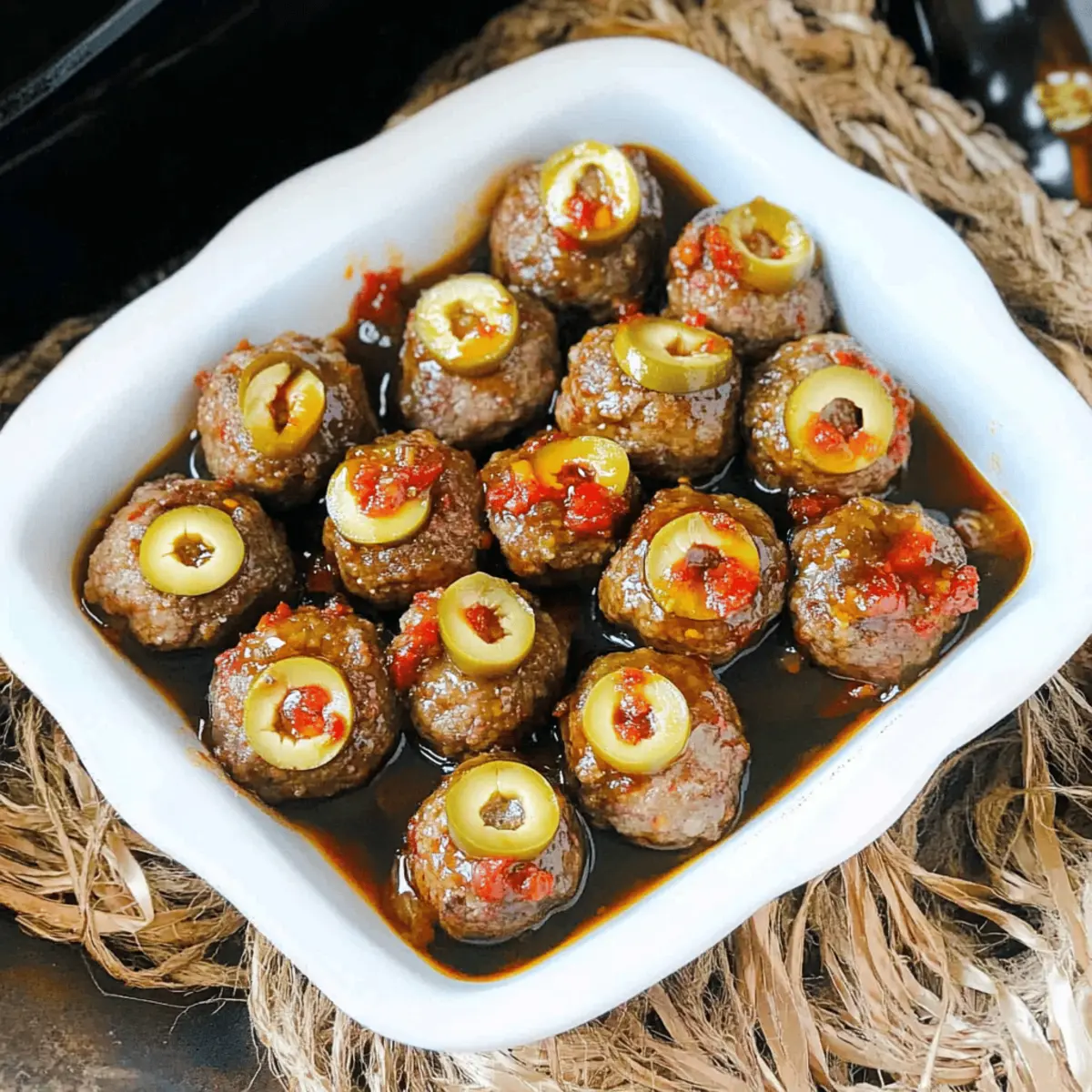- Form meatballs by scooping out about 2 tablespoons of the mixture, placing a sliced olive in each.