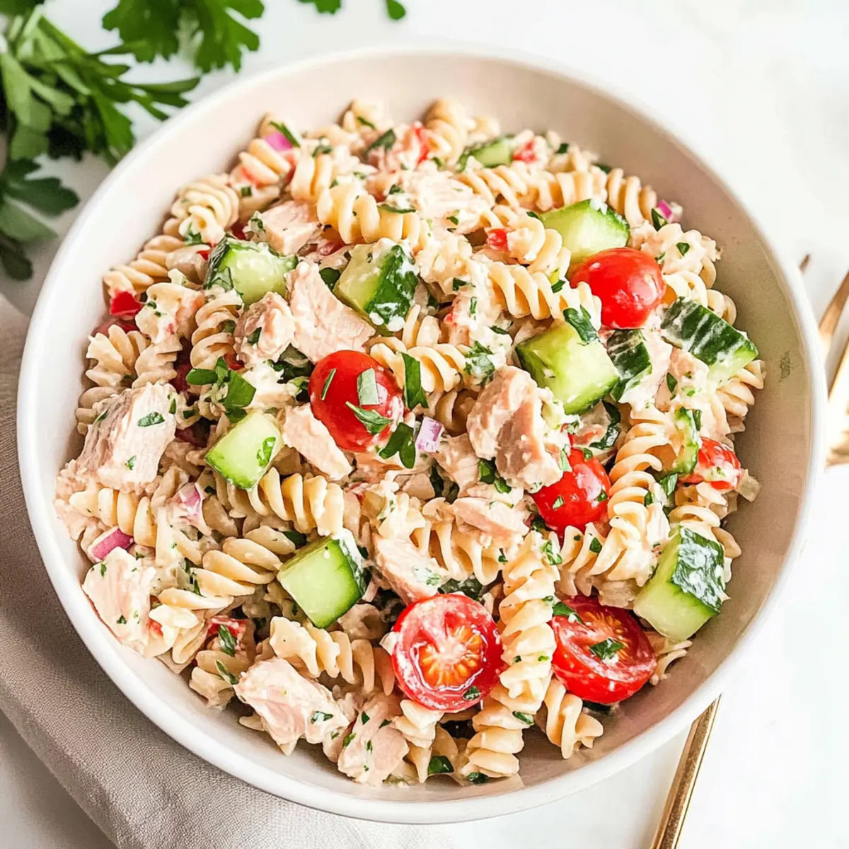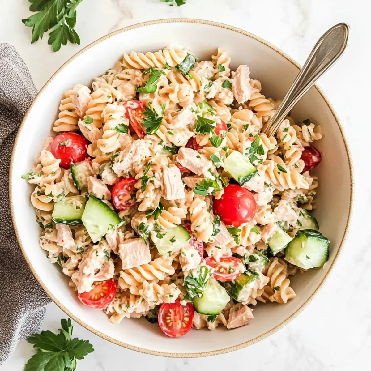 - Combine Ingredients: In a large bowl, add cooled rotini pasta and chunk light tuna. Fold in cucumber, cherry tomatoes, red onion, and parsley. Drizzle dressing over and stir to combine.