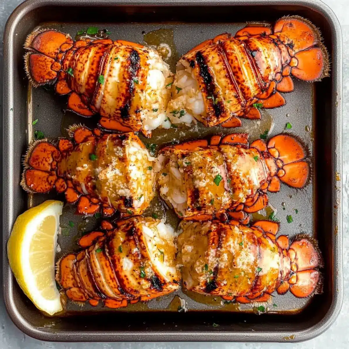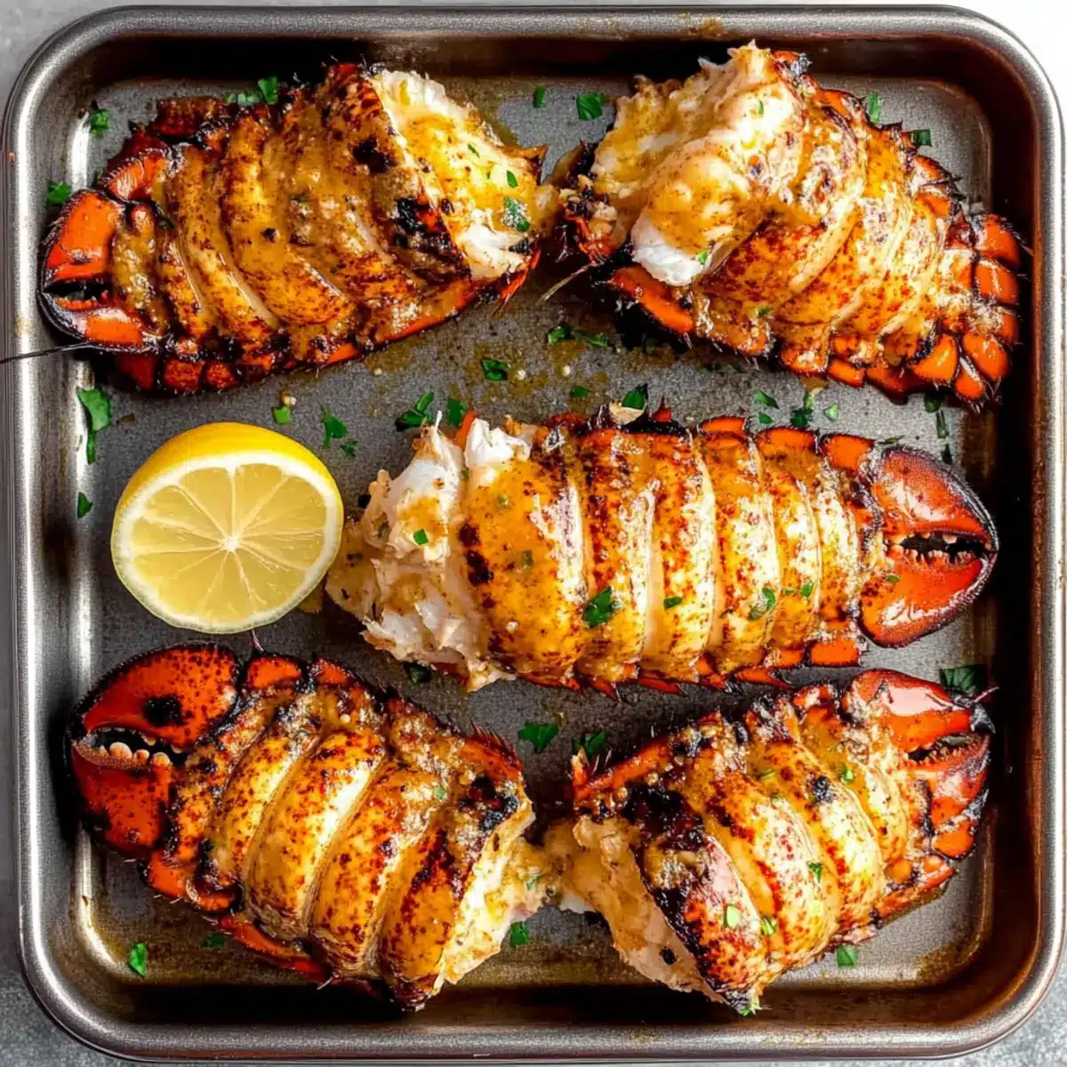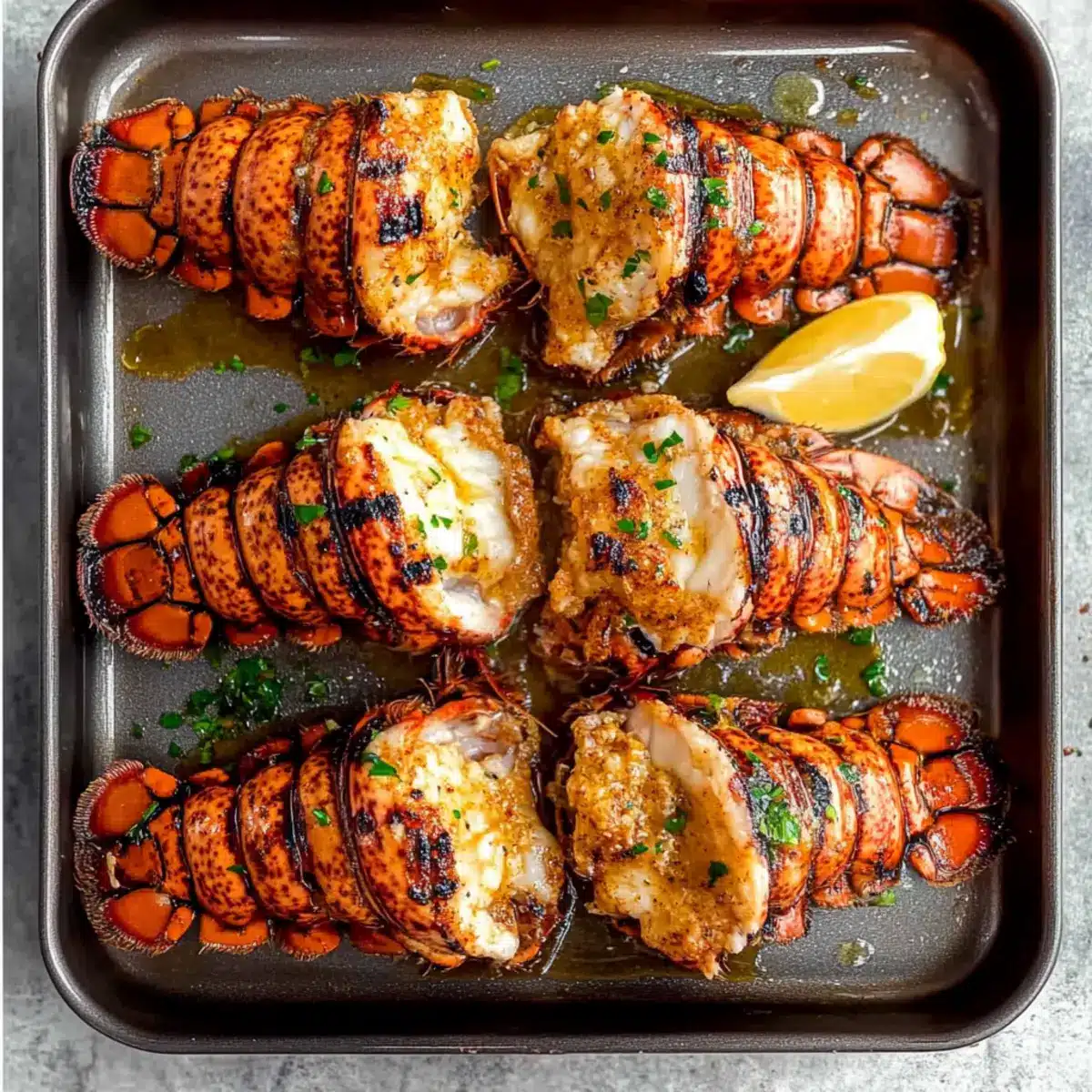 - Once grilled, brush with more garlic butter and squeeze fresh lemon over each tail. Garnish with herbs and serve hot.
