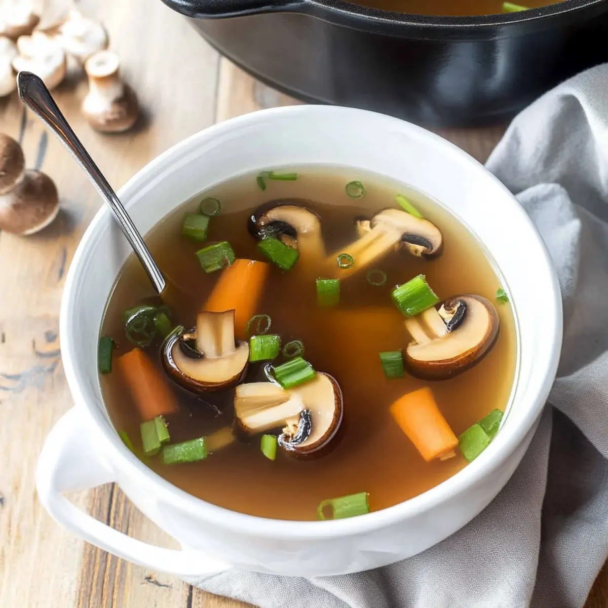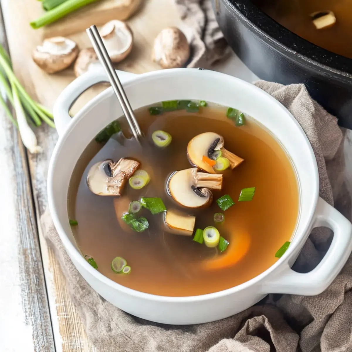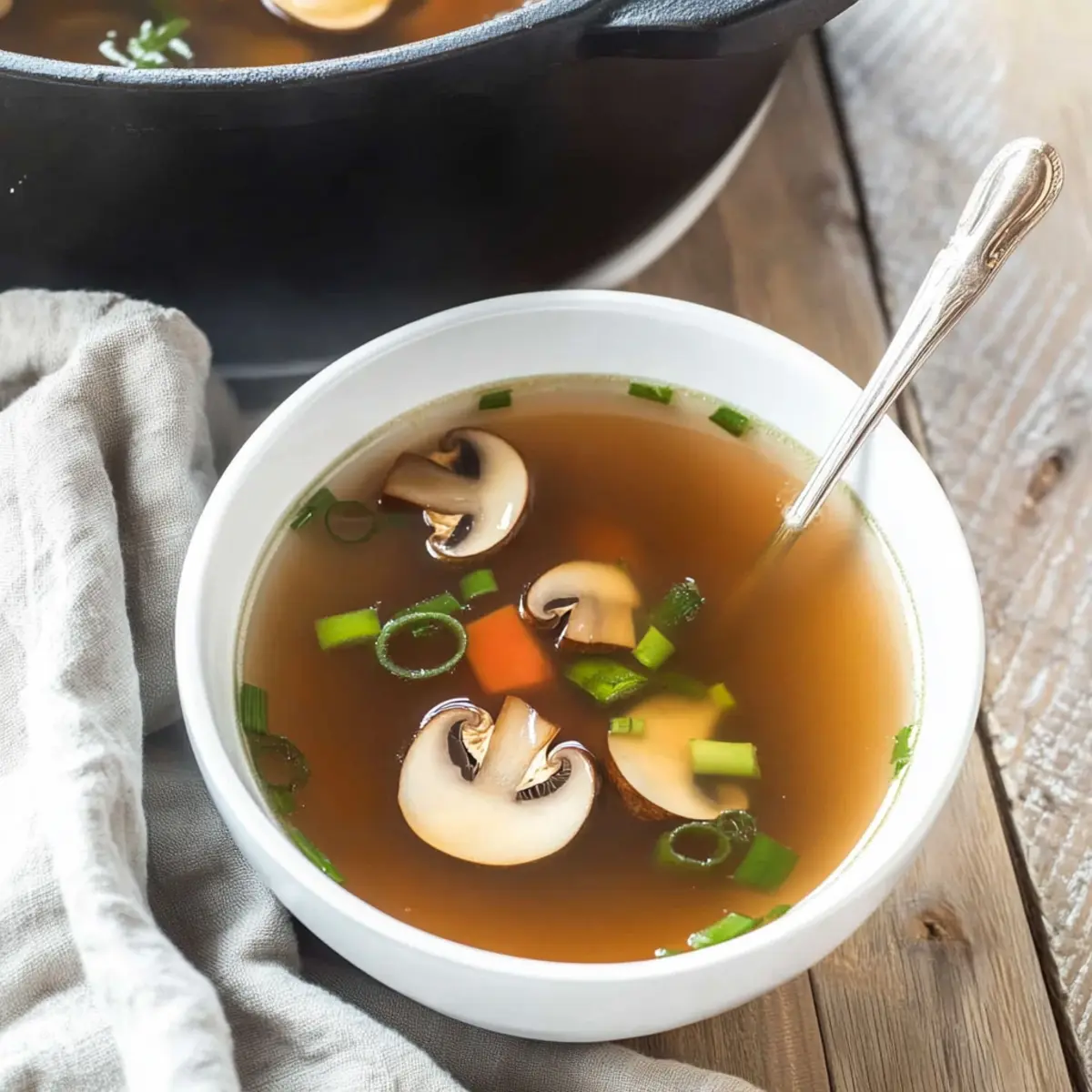 Finally, ladle the warm, clear broth into individual bowls. To enhance the presentation and flavor, garnish each serving with freshly chopped scallions and thinly sliced button mushrooms. Your cozy Japanese Clear Soup is now ready to warm hearts and satisfy appetites!