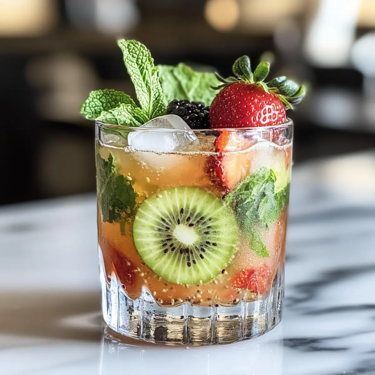 For a smoother texture that enhances the drink’s appeal, grab a fine mesh strainer and place it over a tall glass filled with fresh ice. Carefully pour the muddled mixture through the strainer, allowing the flavorful juice to cascade into the glass while leaving behind any solids. This step ensures your Kiwi & Strawberry Smash Mocktail is light and enjoyable, perfect for sipping on a warm day.