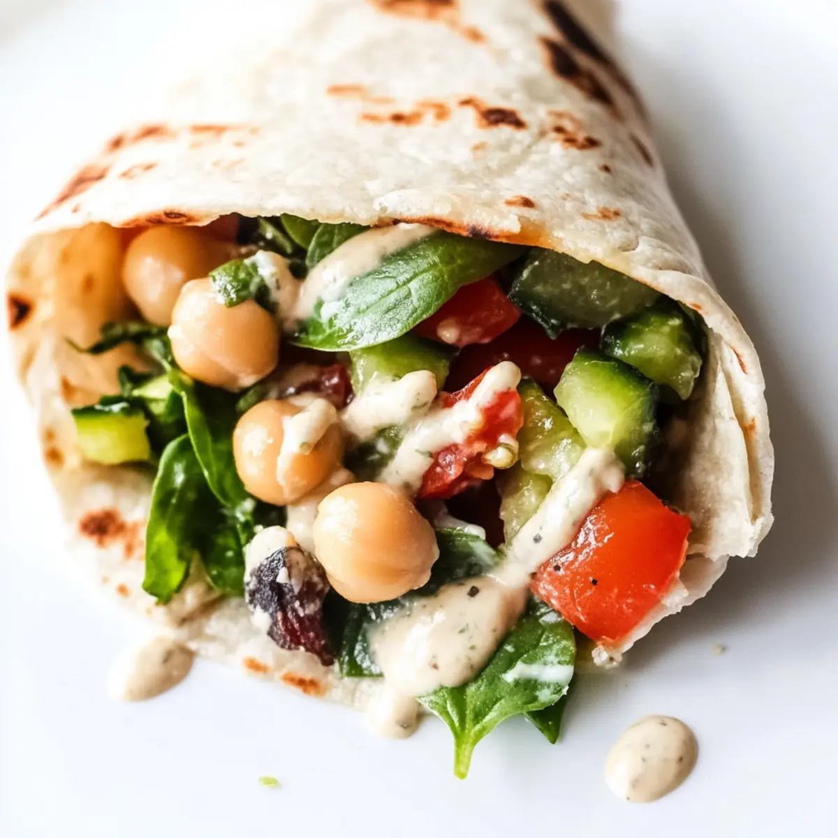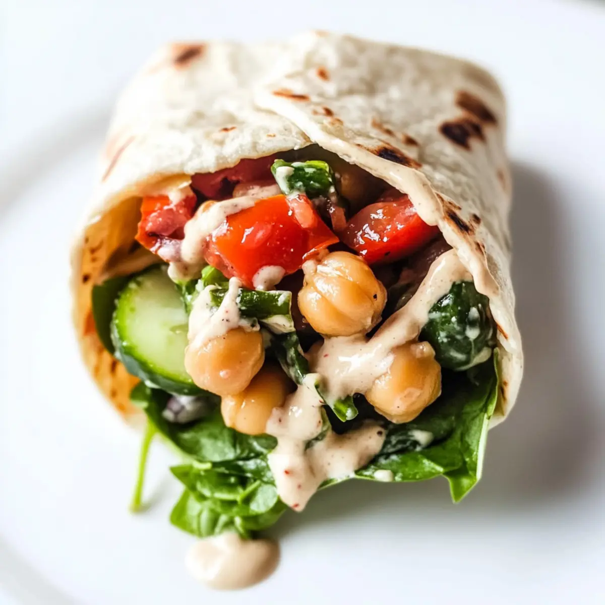Lay out your tortillas on a clean surface. In the center of each tortilla, layer a handful of fresh spinach leaves, followed by 2-3 tablespoons of the warm chickpea mixture, and 2 tablespoons of creamy hummus. Top it off with 2-3 tablespoons of the refreshing tomato-cucumber salad, then drizzle with the tahini sauce for a burst of flavor.