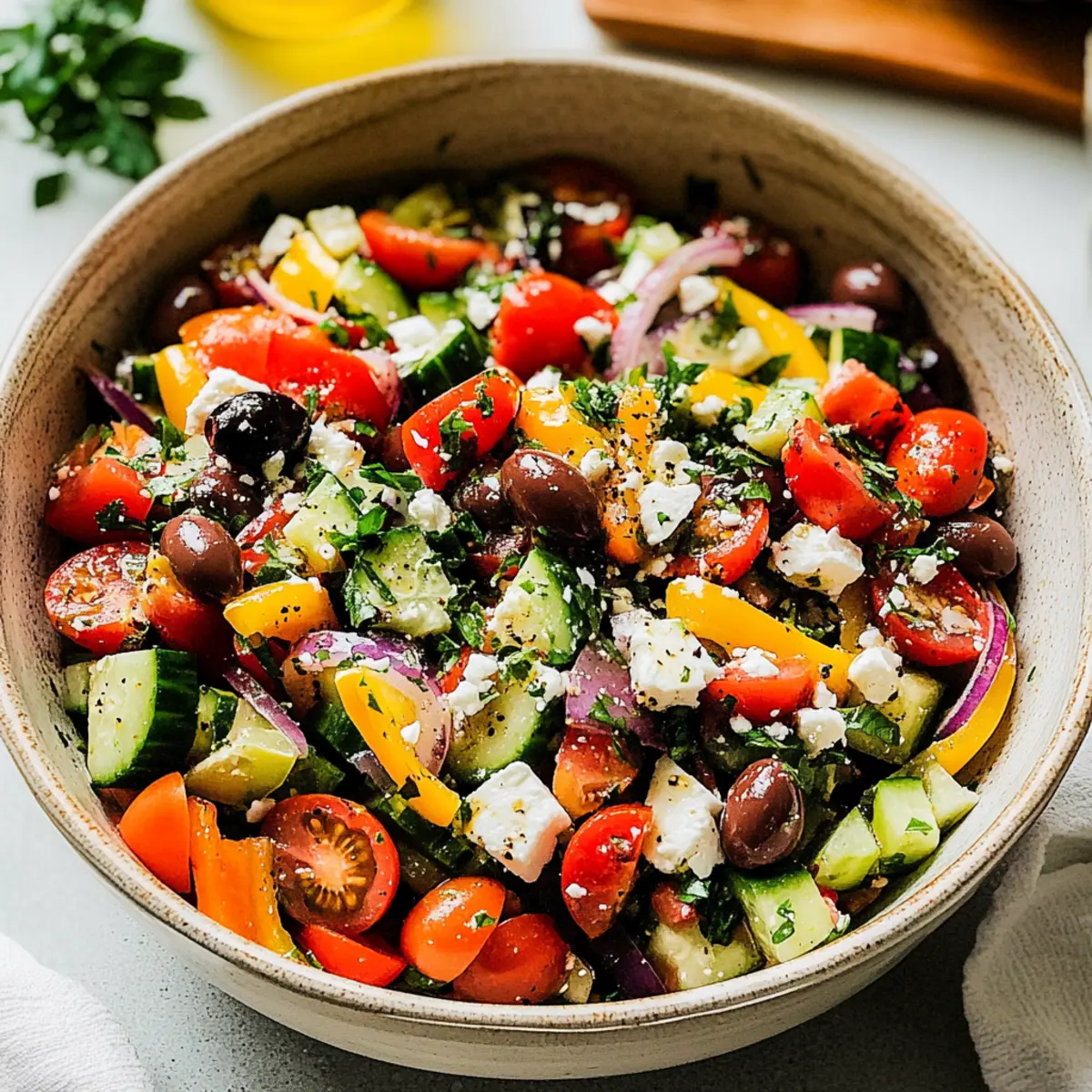 Before serving, chop a handful of fresh parsley and sprinkle it generously over the top of the salad for a bright finish. Serve the Mediterranean Salad immediately for the best texture, or refrigerate for about 10 minutes to allow the flavors to meld further if desired. This refreshing salad is perfect for warm-weather gatherings or as a vibrant meal prep option!