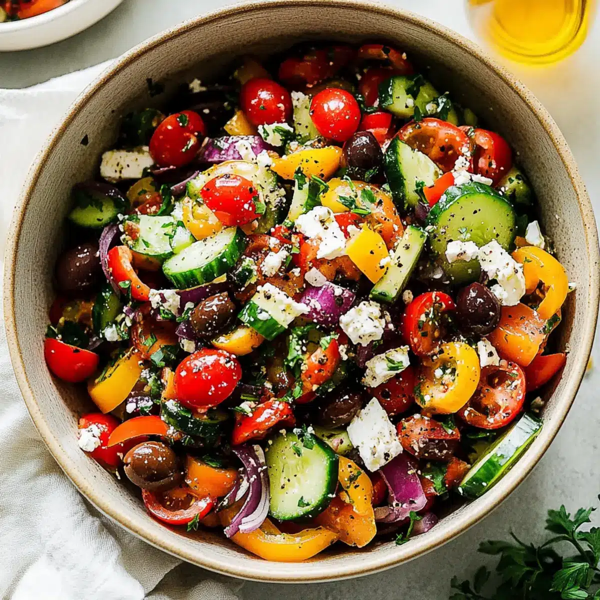 • Customize for Preferences: Don’t hesitate to swap ingredients, like using avocado in place of feta for a creamy vegan option. This way, your Mediterranean Salad can cater to a variety of dietary needs and tastes.