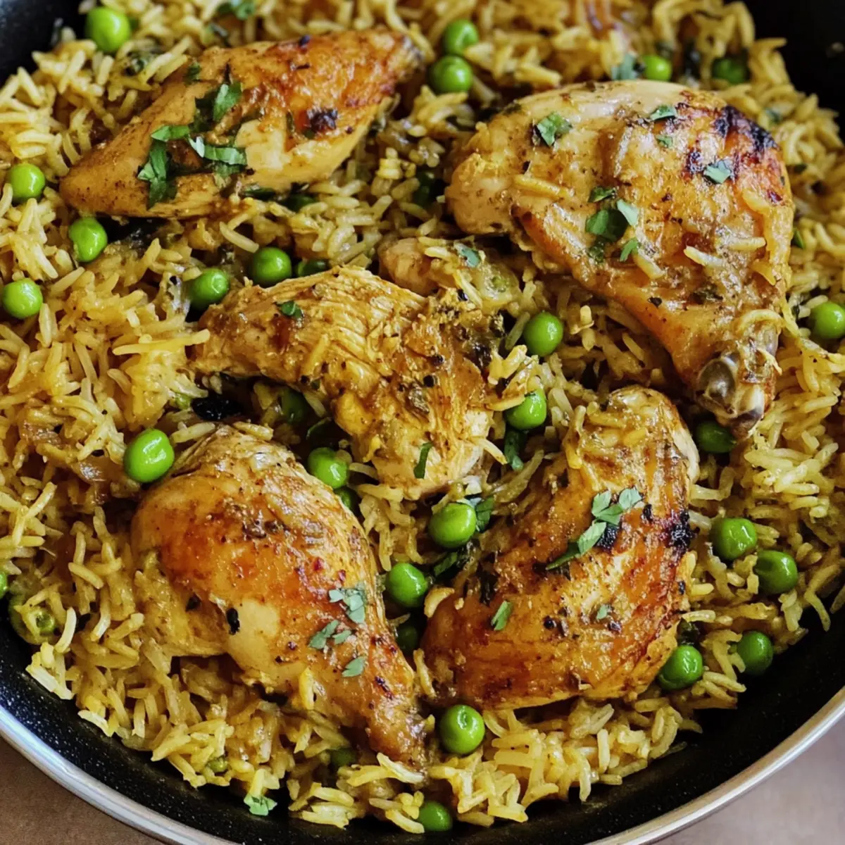 - Once boiling, return the chicken to the pan, nestling it into the rice. Add frozen peas, cover, and reduce heat to low. Simmer for 15-20 minutes until the rice is tender.