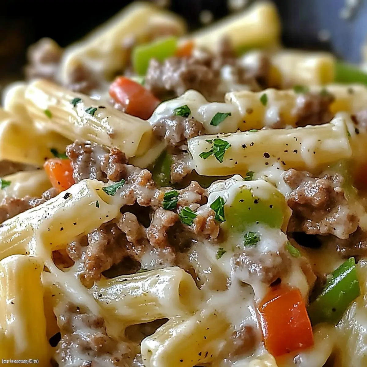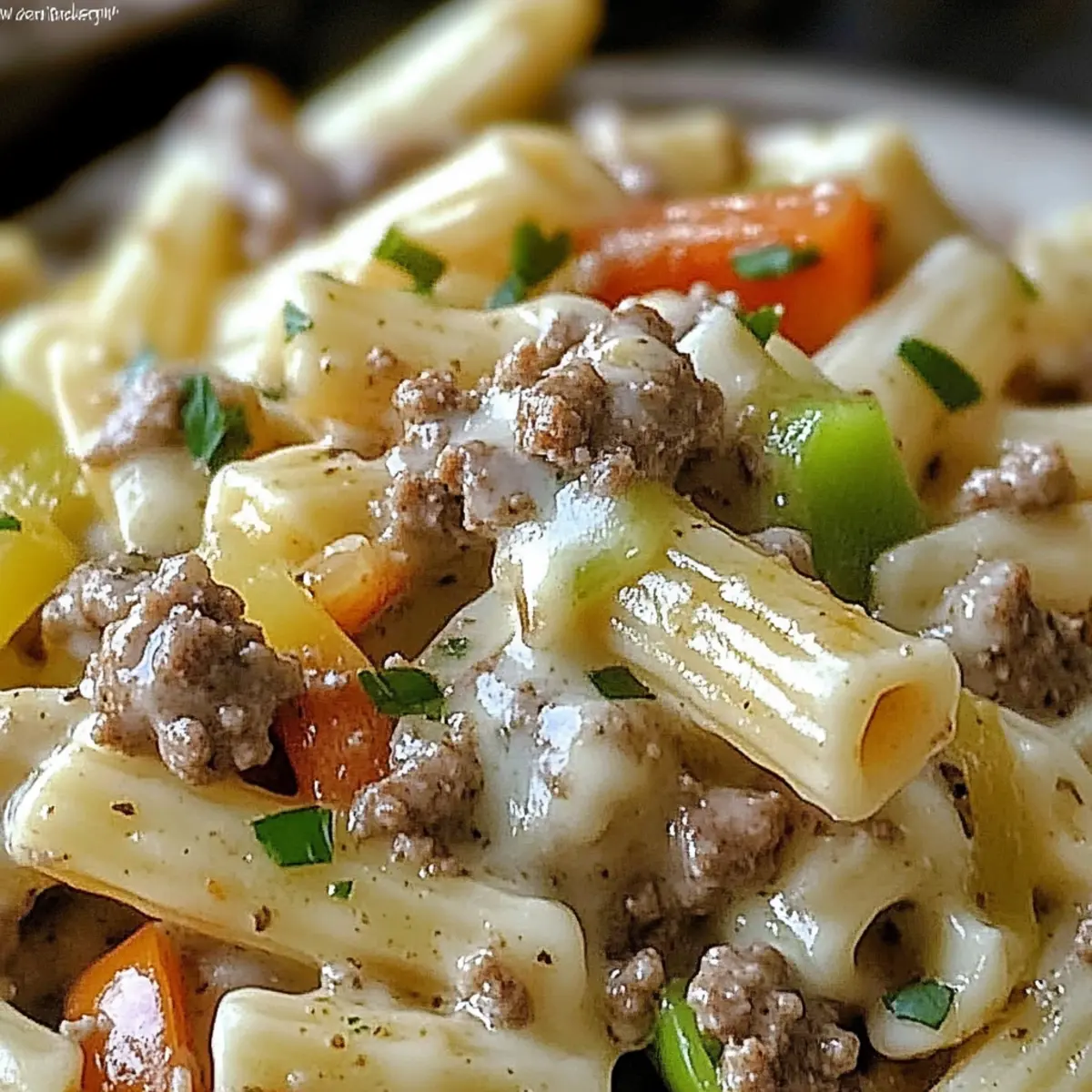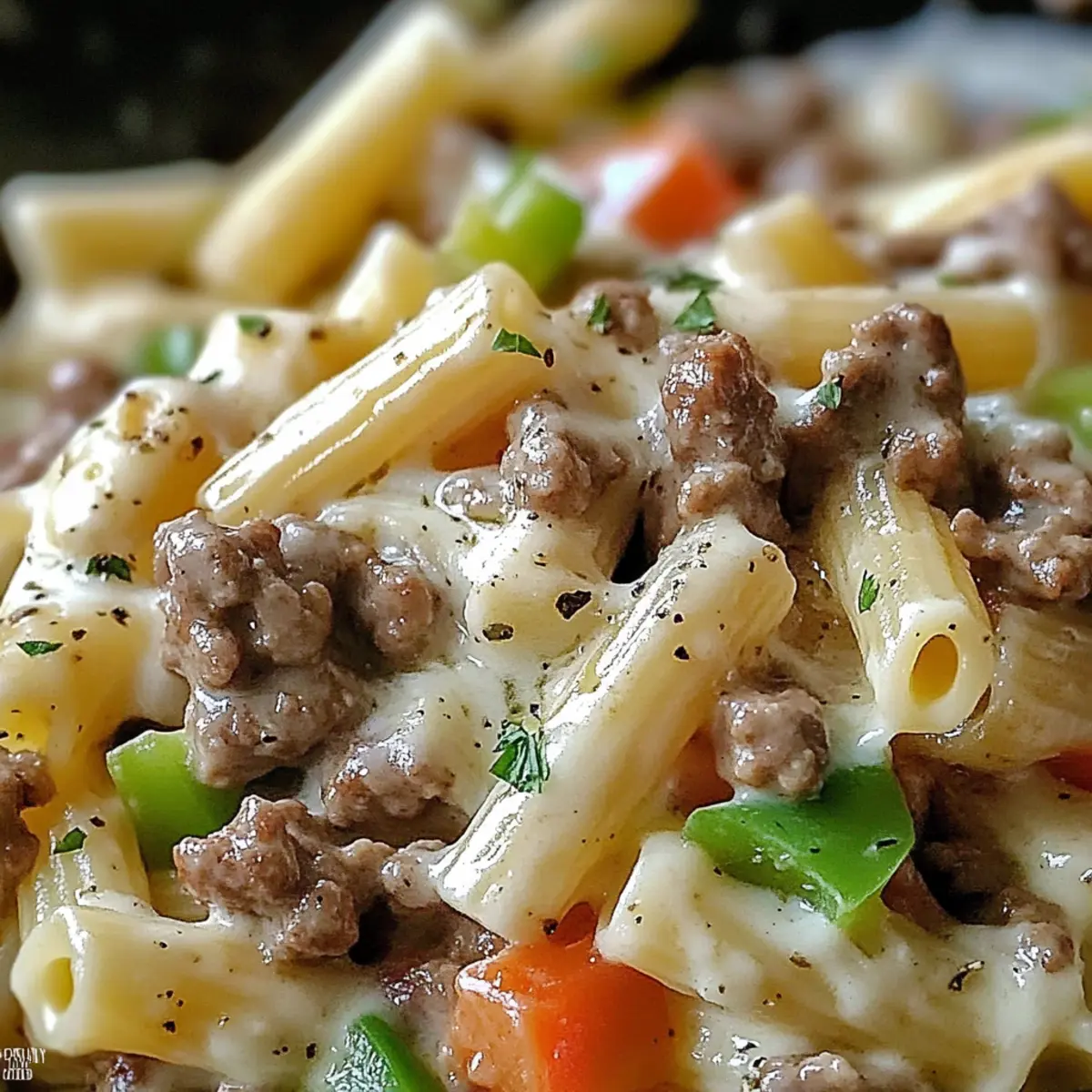 A savory, rich one-skillet pasta with beef recipe that transforms classic cheesesteak flavors into a comforting meal perfect for dinner.