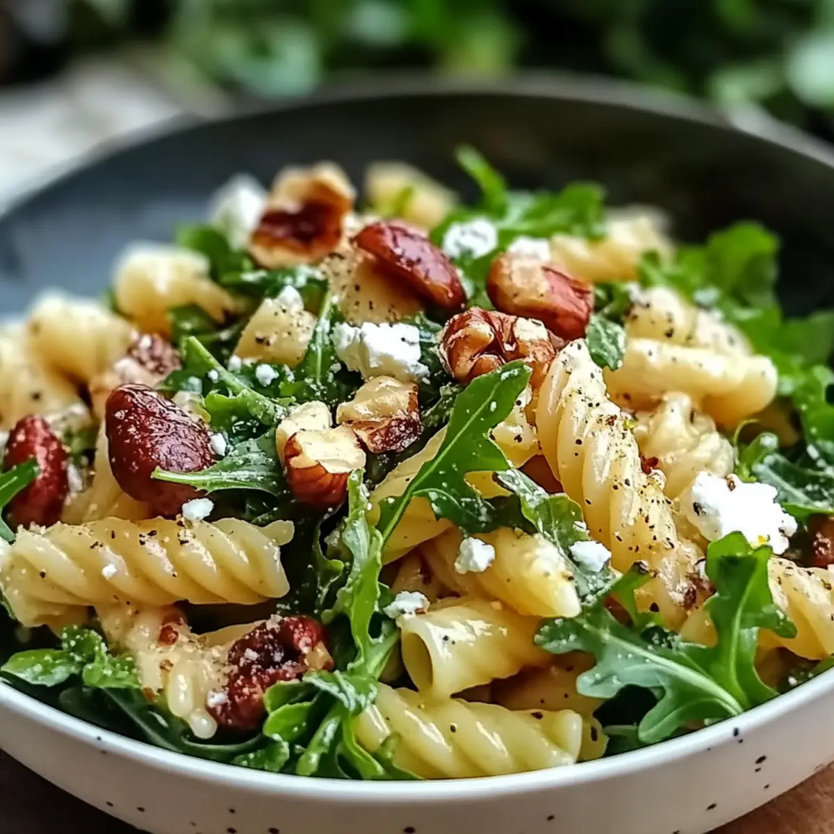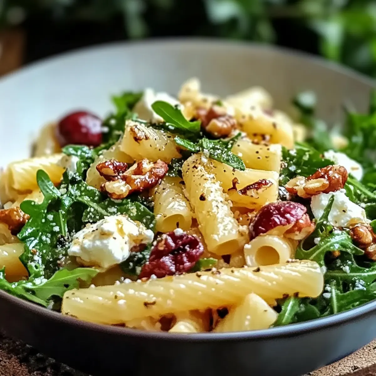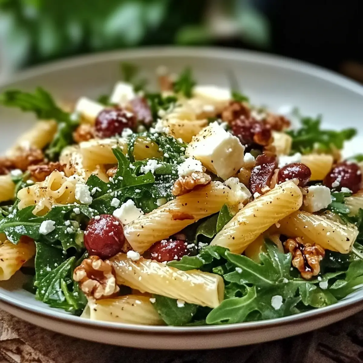 - In a large mixing bowl, combine the cooled pasta with diced pears, arugula, crumbled feta, chopped walnuts, and cranberries. Gently mix to ensure even distribution.