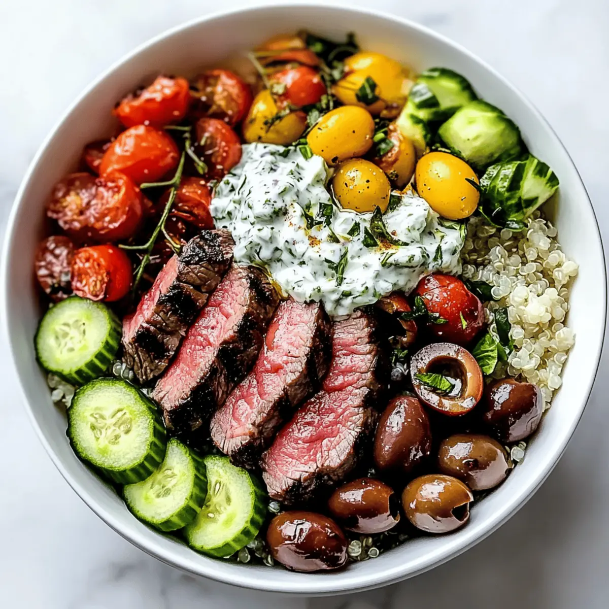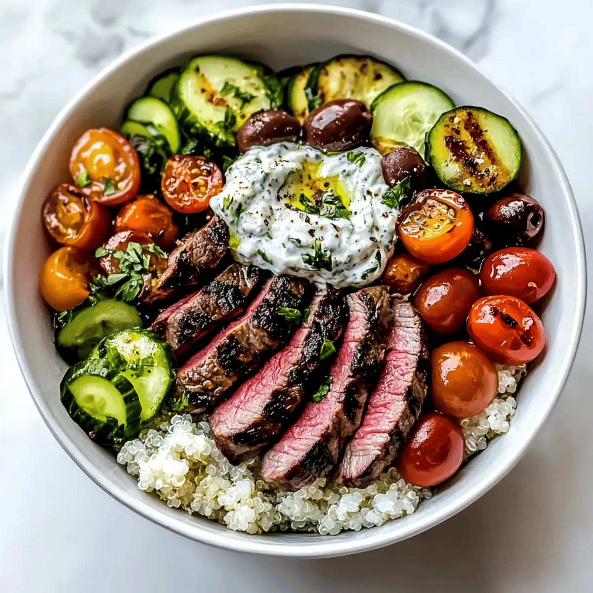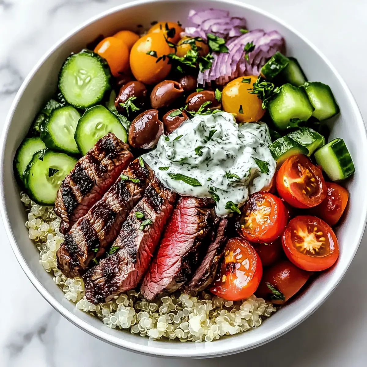 Begin layering your Mediterranean Steak Bowl by placing a generous serving of cooked grains, such as brown rice or quinoa, at the bottom. Next, arrange the sliced steak on top, followed by a colorful assortment of fresh toppings, including cherry tomatoes, cucumber, red onion, and roasted chickpeas. Drizzle the homemade tzatziki and vinaigrette over the entire bowl, completing this hearty and vibrant meal.