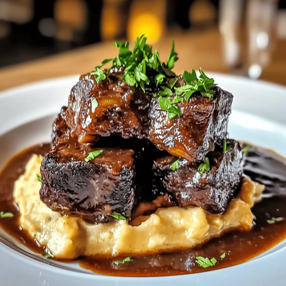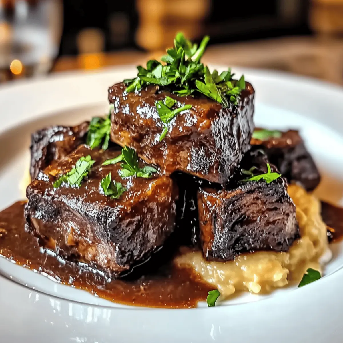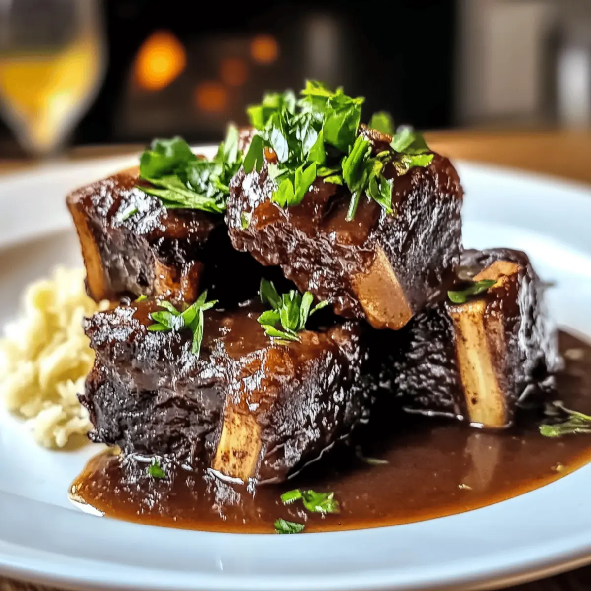After braising, remove the pot from the oven and skim excess fat from the top of the sauce for a cleaner finish. Let the ribs rest for a few minutes before serving. Garnish with freshly chopped parsley for a touch of brightness, and enjoy this sumptuous dish with sides of your choice.