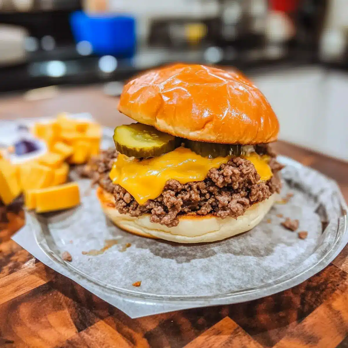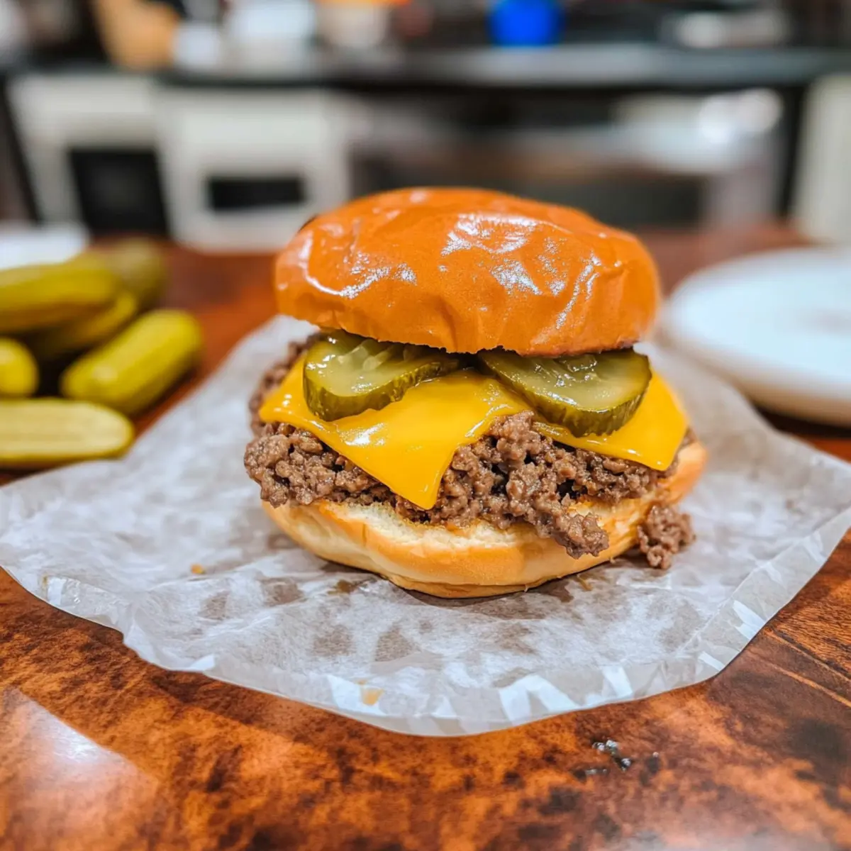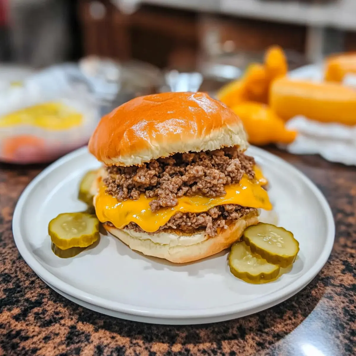 - Assemble the sandwiches with a generous portion of meat mixture, a slice of cheese, diced pickles, and mustard.