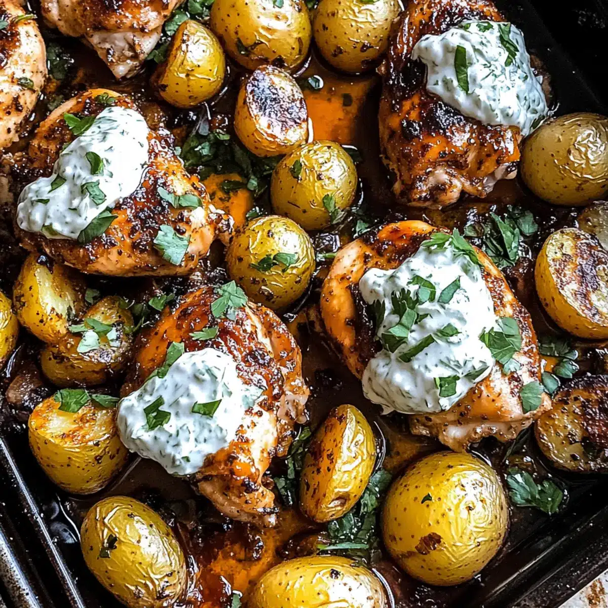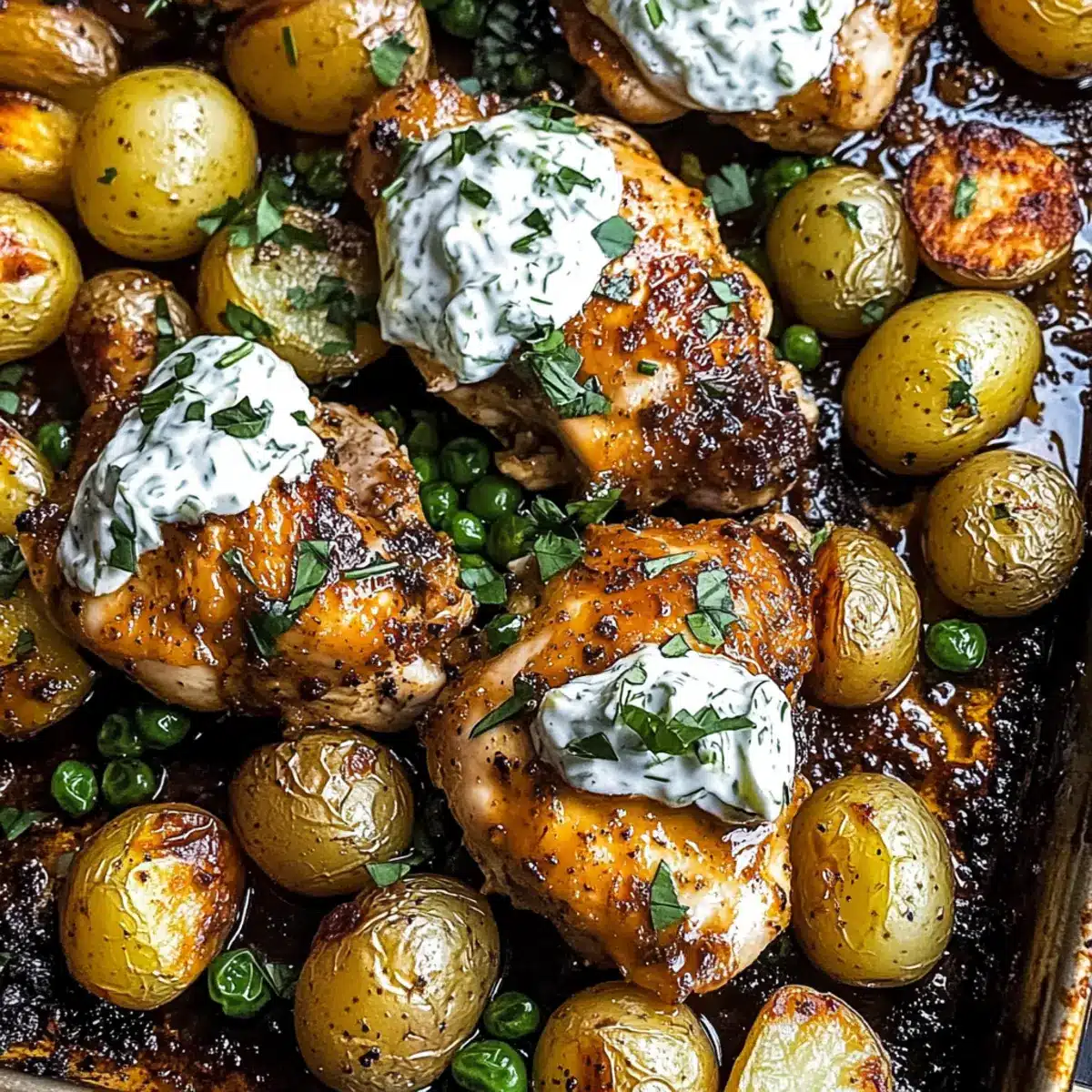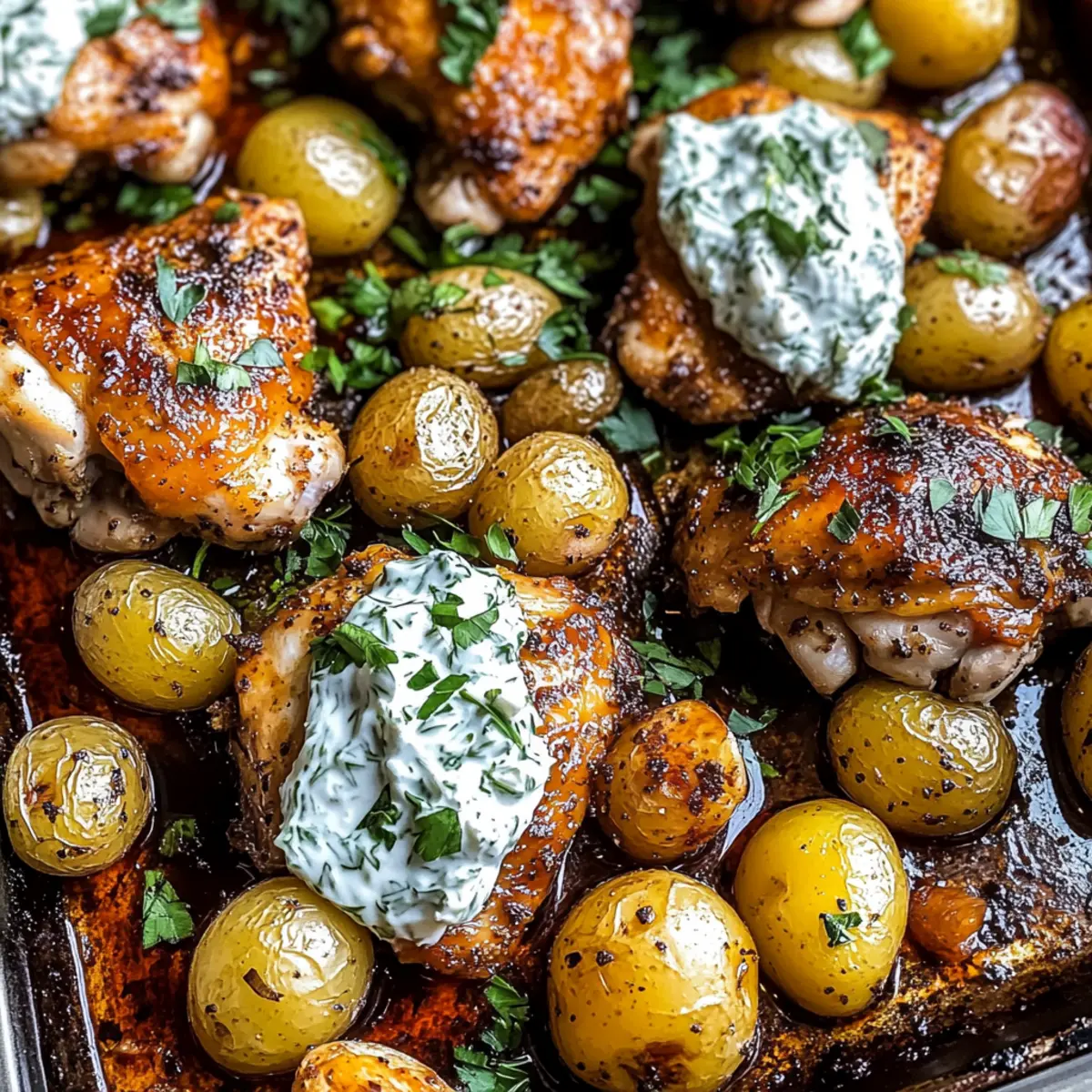 Uniform potato sizes ensure even cooking. Choose chicken thighs for juiciness. Watch chicken and potatoes while baking to avoid overcooking. Prepare Tzatziki a day in advance for better flavor. Store leftovers in an airtight container.
