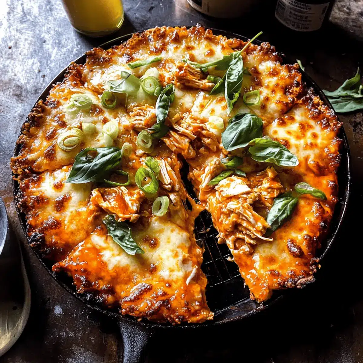 Once baked, remove the skillet from the oven and let it cool for a couple of minutes on a heat-resistant surface. This brief cooling aids in cutting. Top your pizza with freshly chopped scallions and an extra drizzle of buffalo sauce for a kick of freshness. Slice and serve hot for that ultimate comfort food experience that everyone will adore.