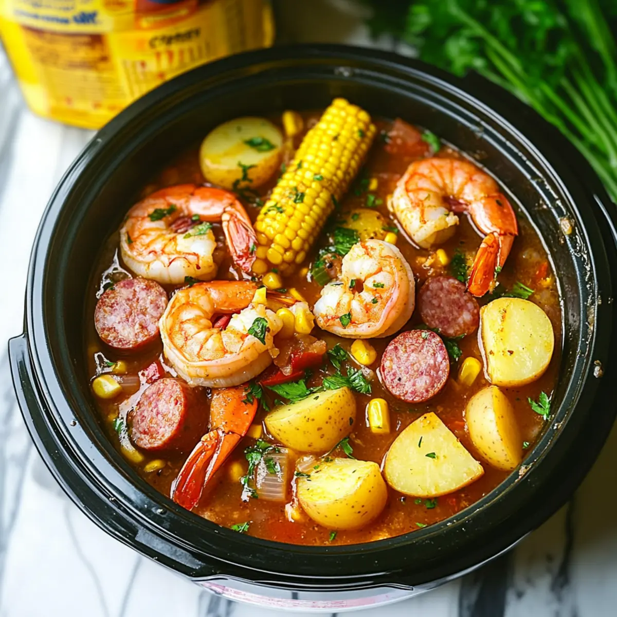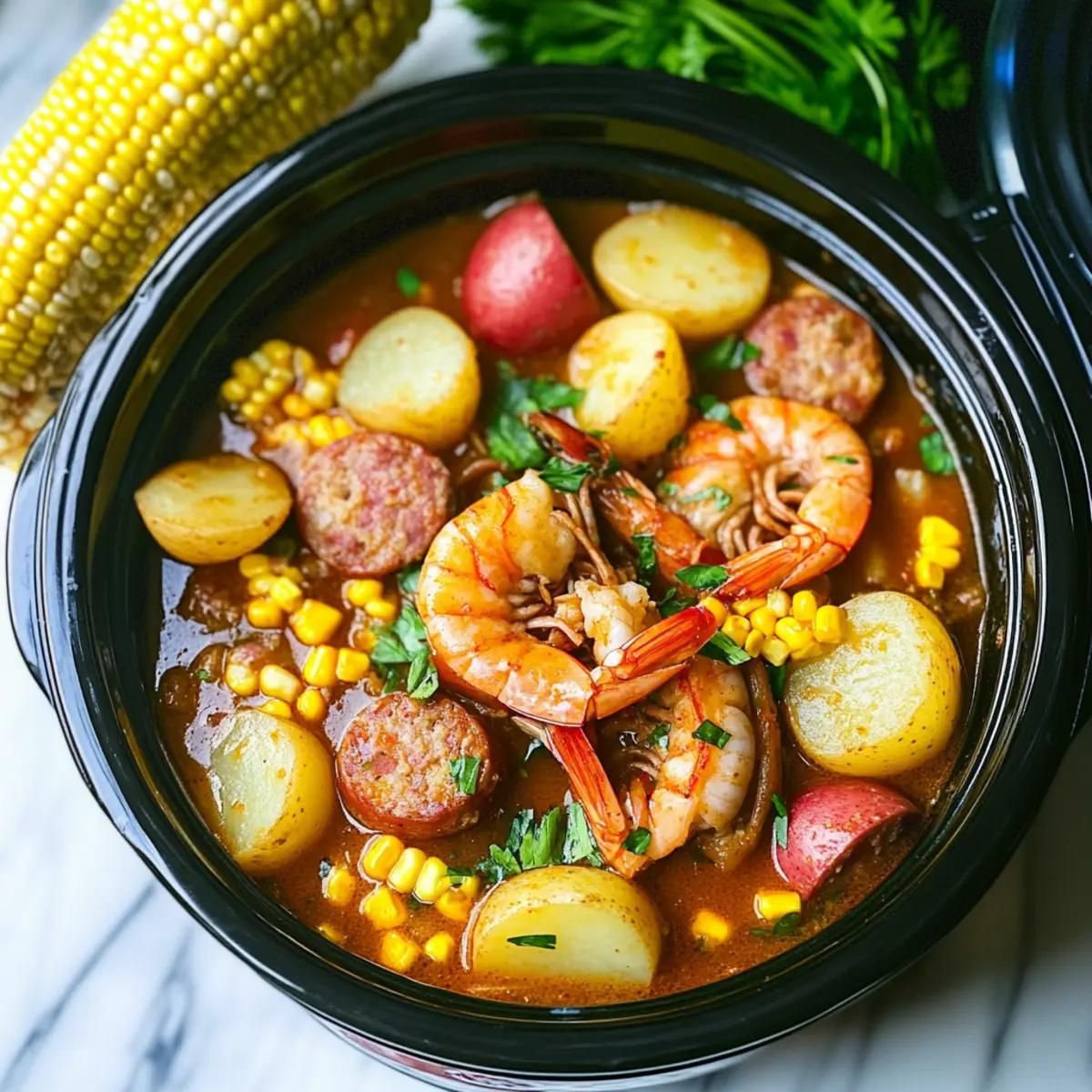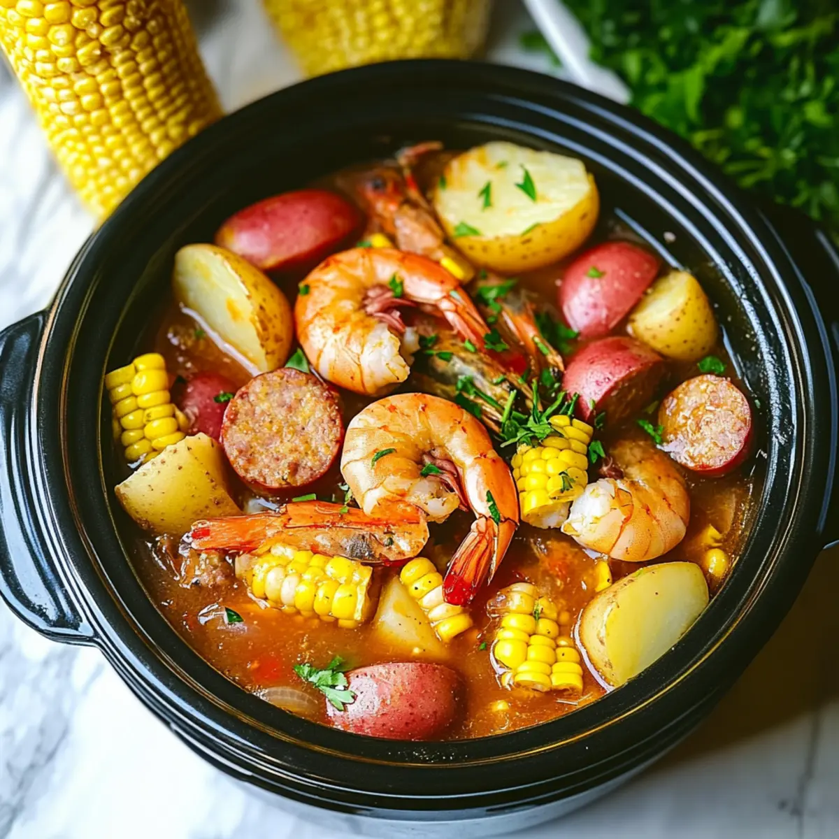 • Dive into the delightful flavors of this Slow Cooker Shrimp Boil with the following ingredients:
