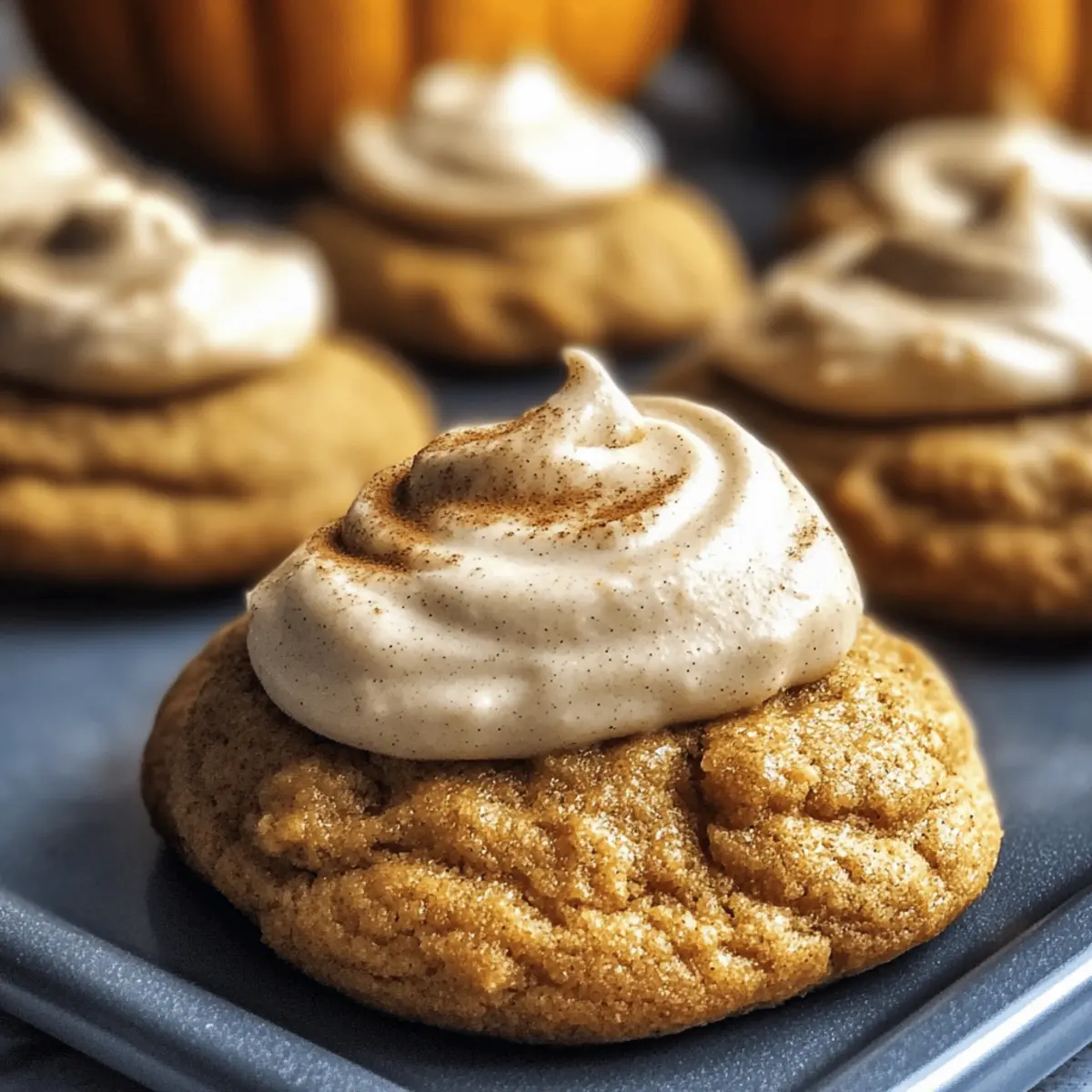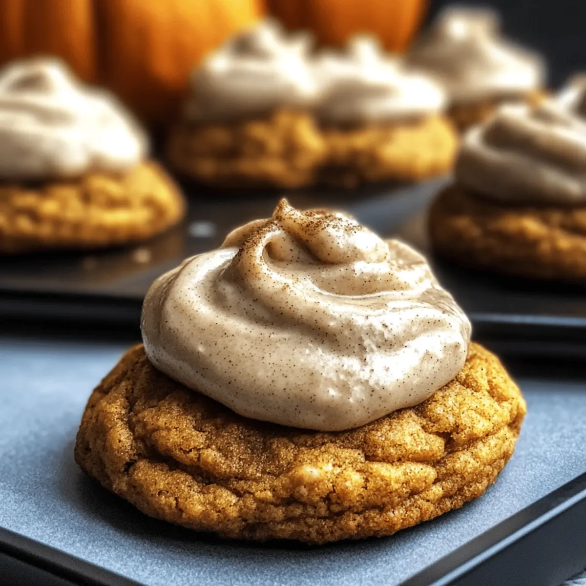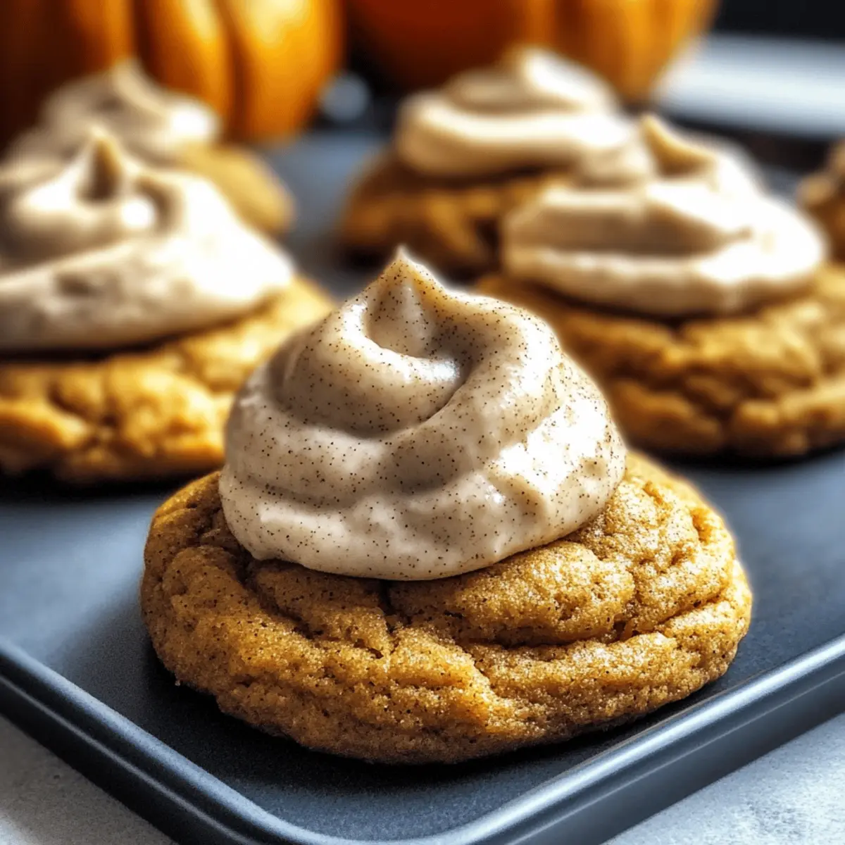 Allow the cookies to cool completely on a wire rack. Once cooled, use a piping bag or a spatula to swirl the creamy cinnamon frosting onto each cookie. For an extra touch of flavor, you can dust them with additional pumpkin pie spice, enhancing their fall-inspired essence.