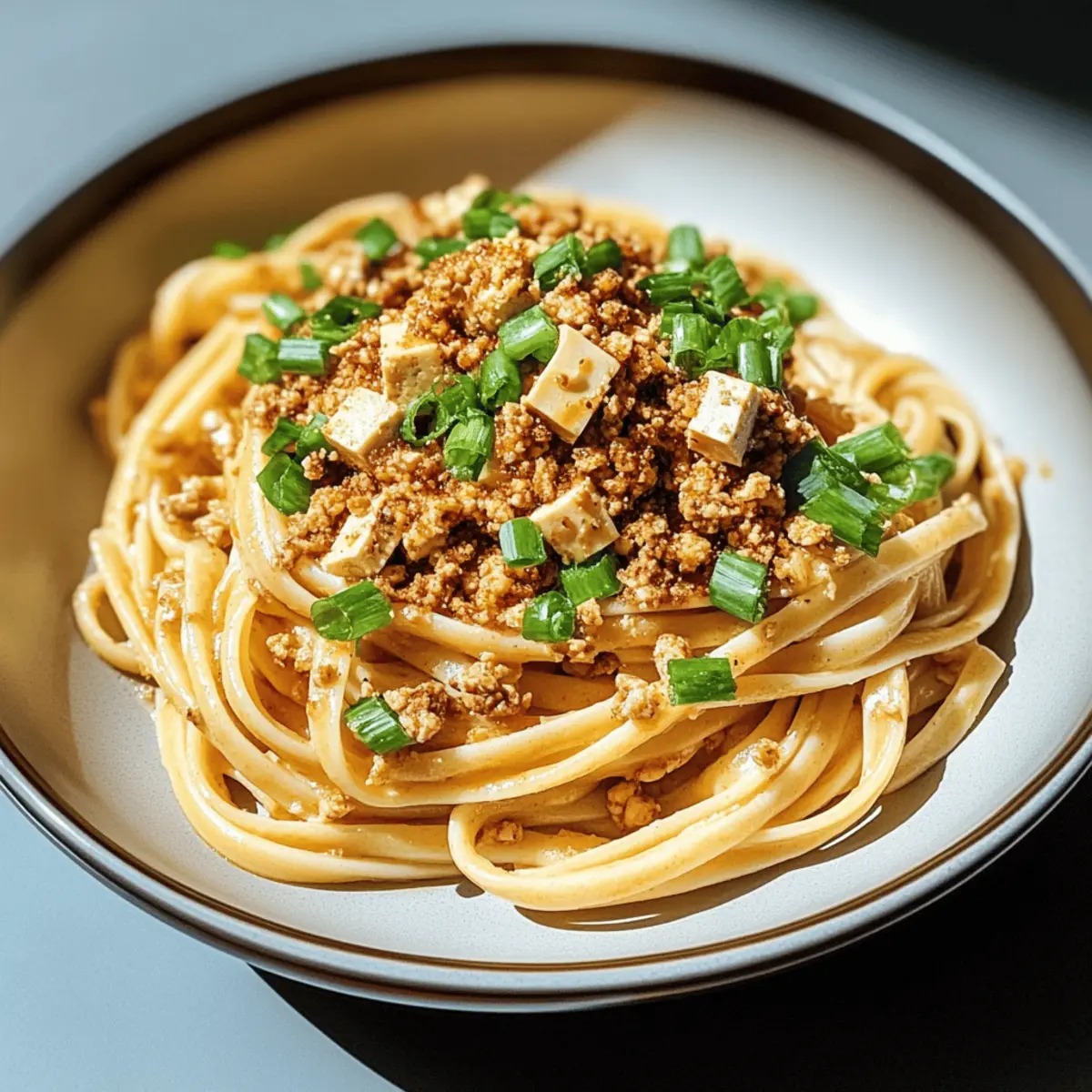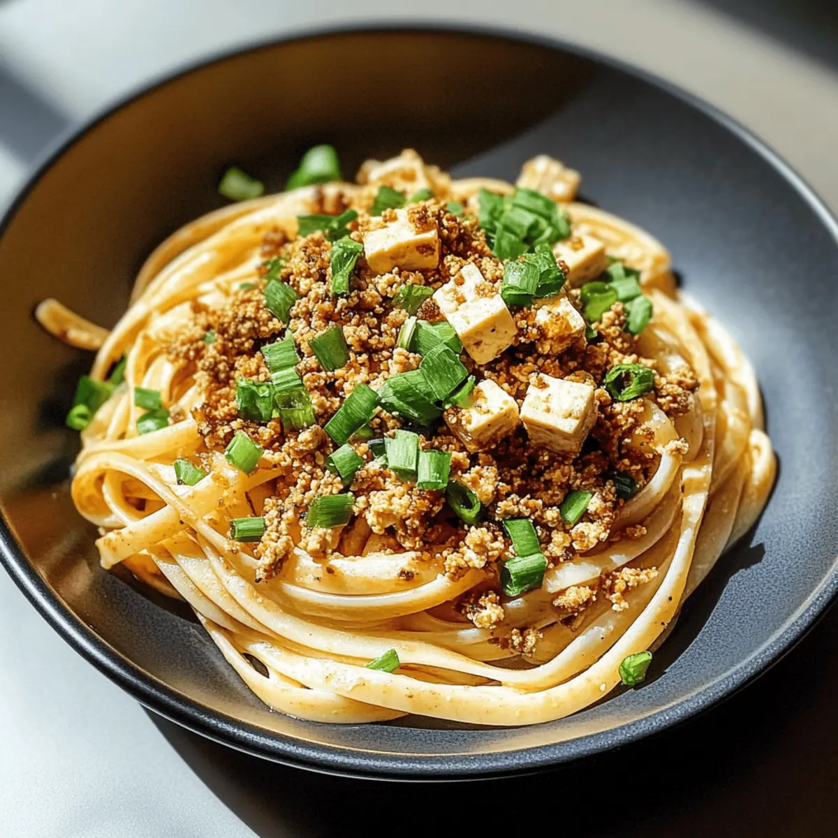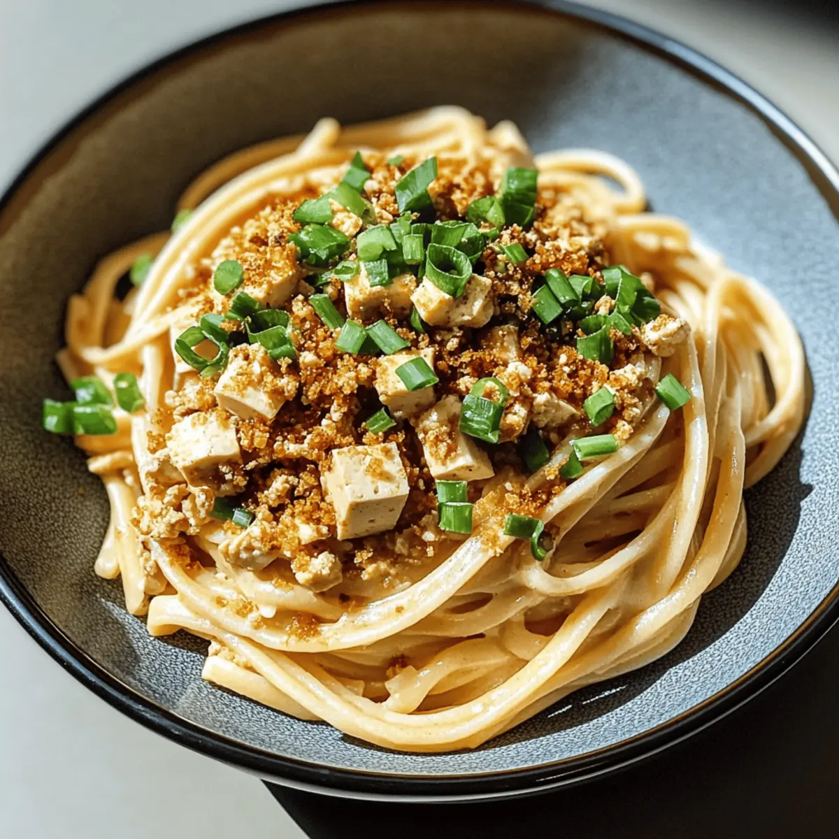 - Transfer the Spicy Miso Pasta to serving bowls. Top generously with the crispy tofu crumble and garnish with the green parts of the scallions for a fresh finish. Serve immediately.
