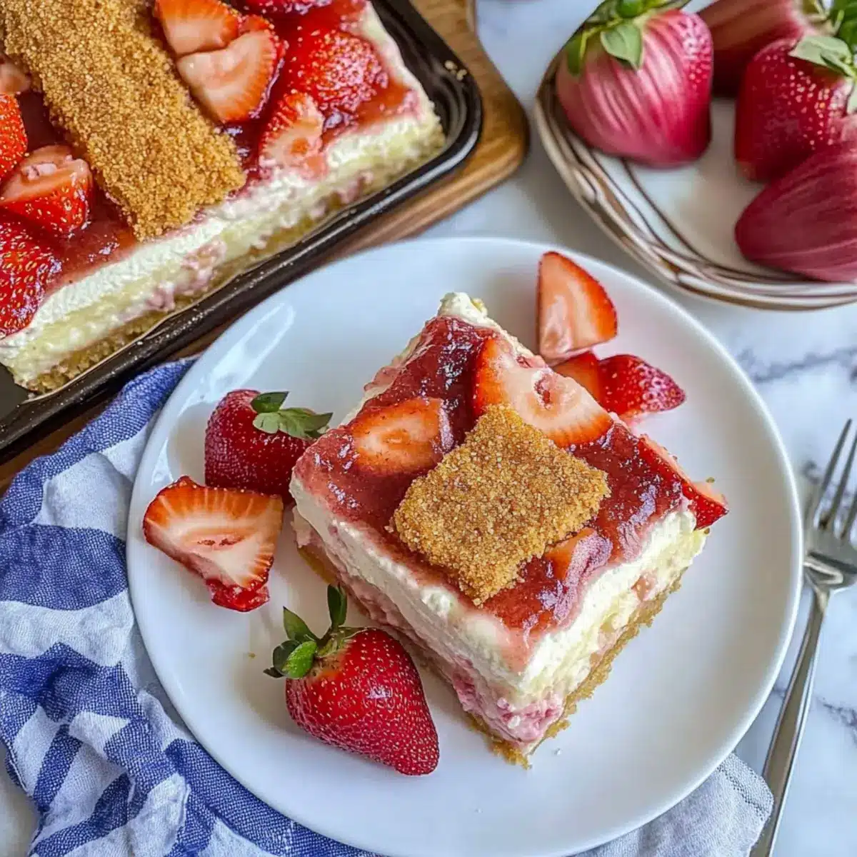 1. After chilling, slice the dessert into squares and plate them for your guests. Garnish with extra sliced strawberries or crushed graham crackers if desired.