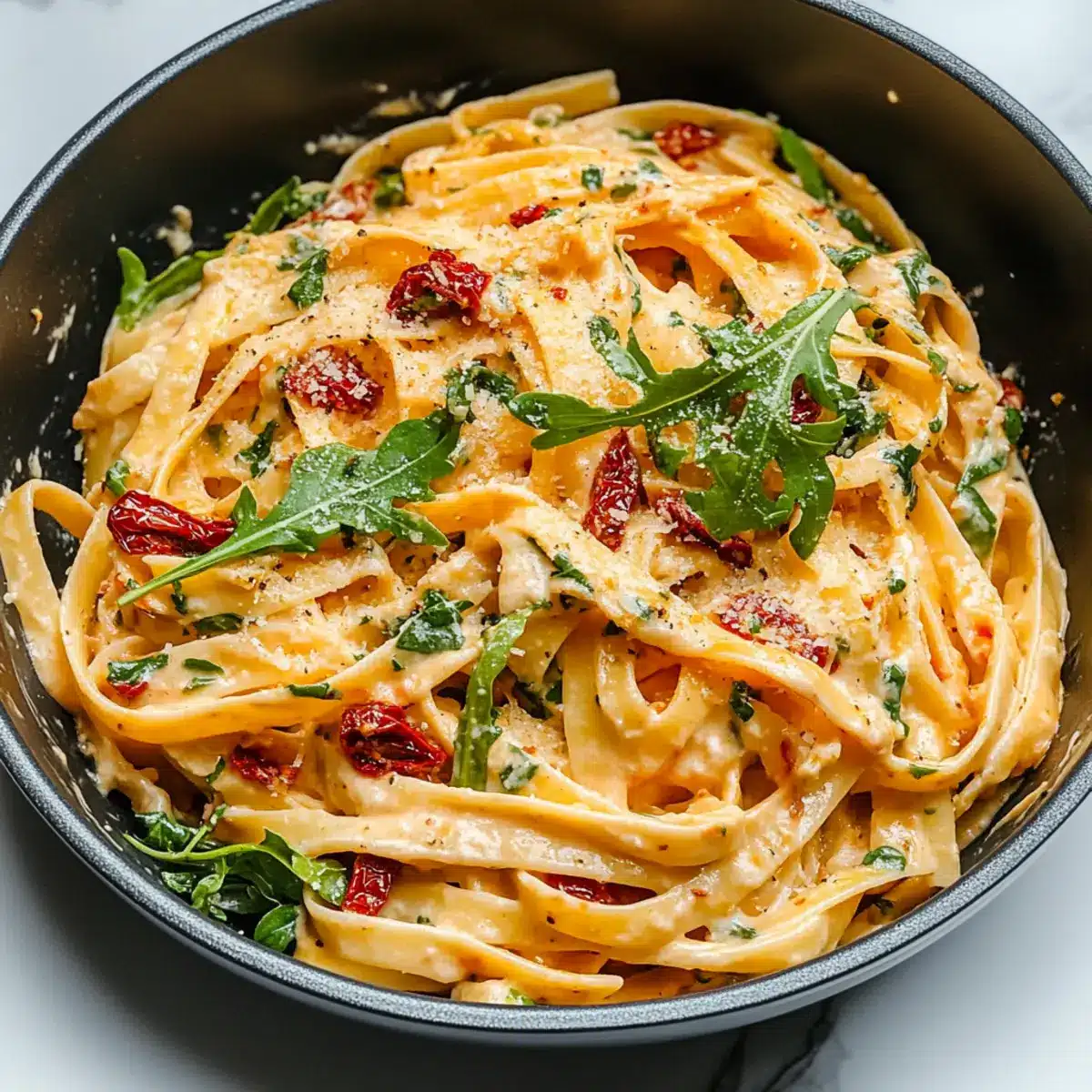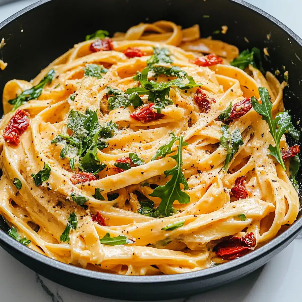 - Add the drained fettuccine and arugula to the skillet with the creamy sauce. Toss gently until pasta is evenly coated and arugula wilts slightly. Add reserved pasta water if sauce is too thick.